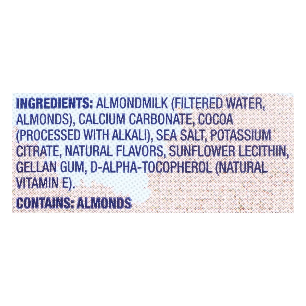Almond Milk (Filtered Water, Almonds), Calcium Carbonate, Cocoa (Processed with Alkali), Sea Salt, Potassium Citrate, Natural Flavors, Sunflower Lecithin, Gellan Gum, D-Alpha-Tocopherol (Natural Vitam…