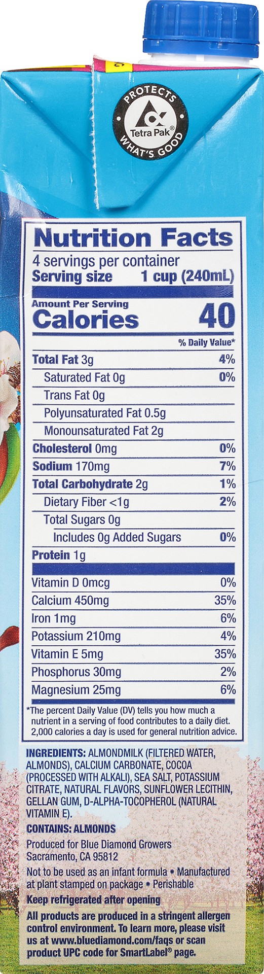 Almond Milk (Filtered Water, Almonds), Calcium Carbonate, Cocoa (Processed with Alkali), Sea Salt, Potassium Citrate, Natural Flavors, Sunflower Lecithin, Gellan Gum, D-Alpha-Tocopherol (Natural Vitam…