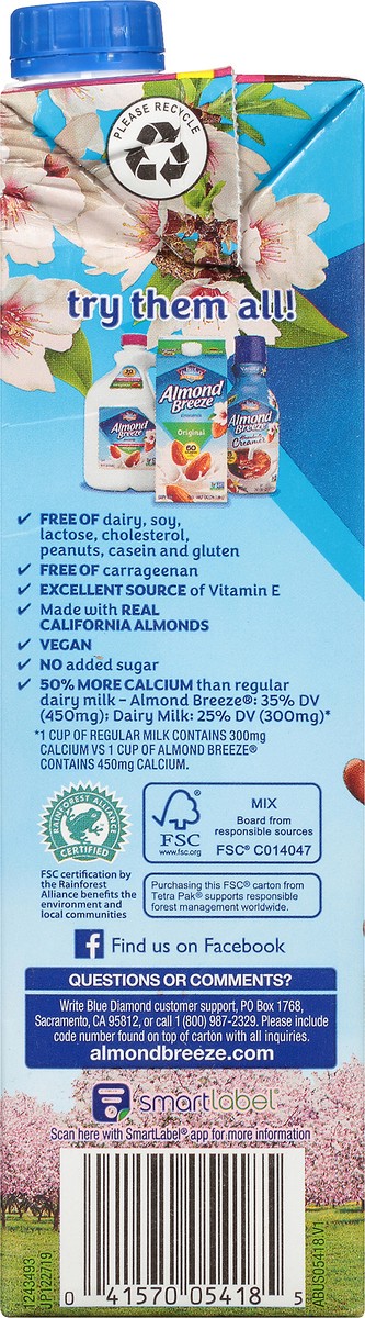 40 calories per serving. Dairy free. Free of dairy, soy, lactose, cholesterol, peanuts, casein and gluten. Vegan. No added sugar. 50% more calcium than regular dairy milk - Almond Breeze: 35% DV (450 …