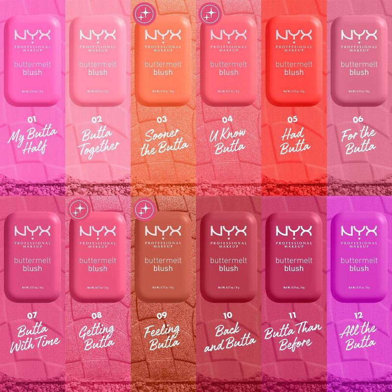 - NYX Professional Makeup Buttermelt Blush (Pink Blush): A high pigment, soft buttery powder blush with booming pigment, butta blend, and butta wear. Infused with mango butter, almond butter, and shea butter, it doesn't get any butta than this!