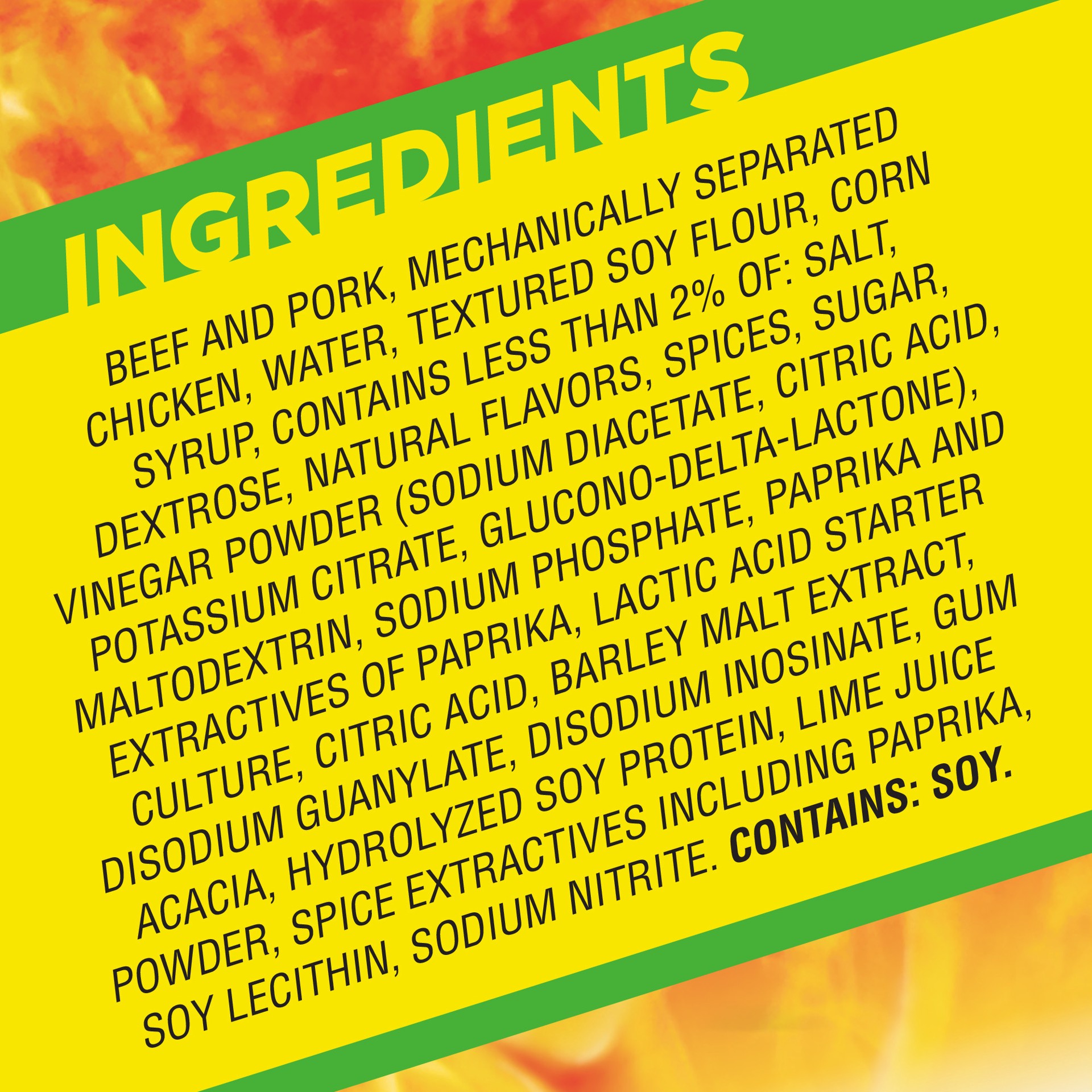 Beef and Pork, Mechanically Separated Chicken, Water, Textured Soy Flour, Corn Syrup, Contains less than 2% of: Salt, Dextrose, Natural Flavors, Spices, Sugar, Vinegar Powder (Sodium Diacetate, Citric…
