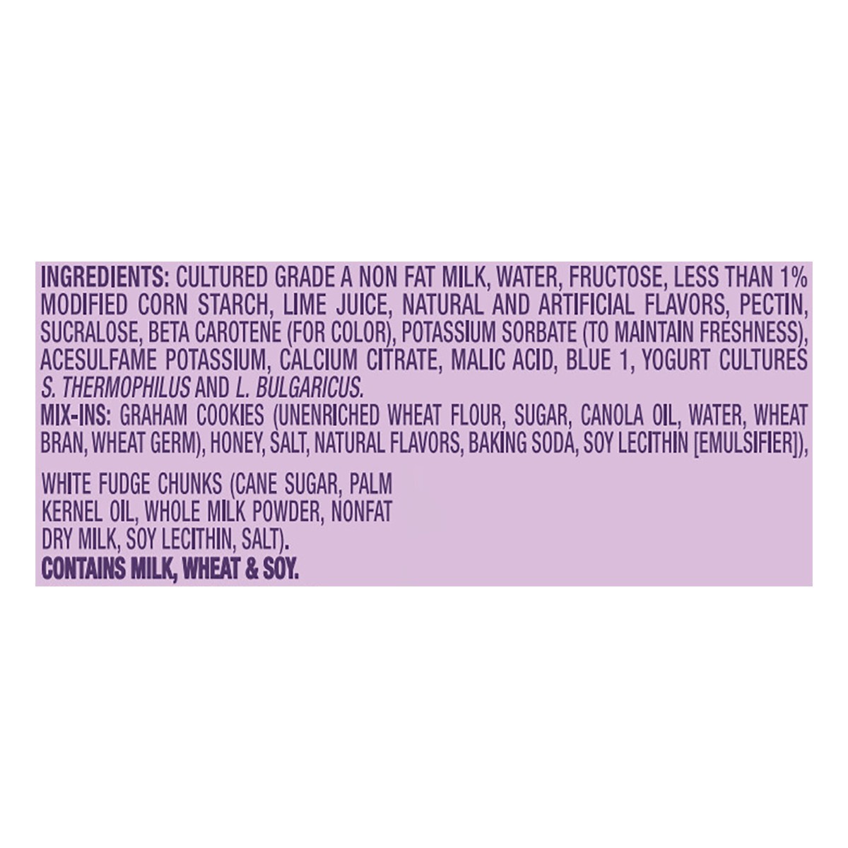 Fat Free Yogurt: Cultured Grade A Non Fat Milk, Water, Fructose, Less than 1%: Modified Food Starch, Lime Juice, Natural & Artificial Flavors, Pectin, Sucralose, Beta Carotene (for Color), Potassium S…