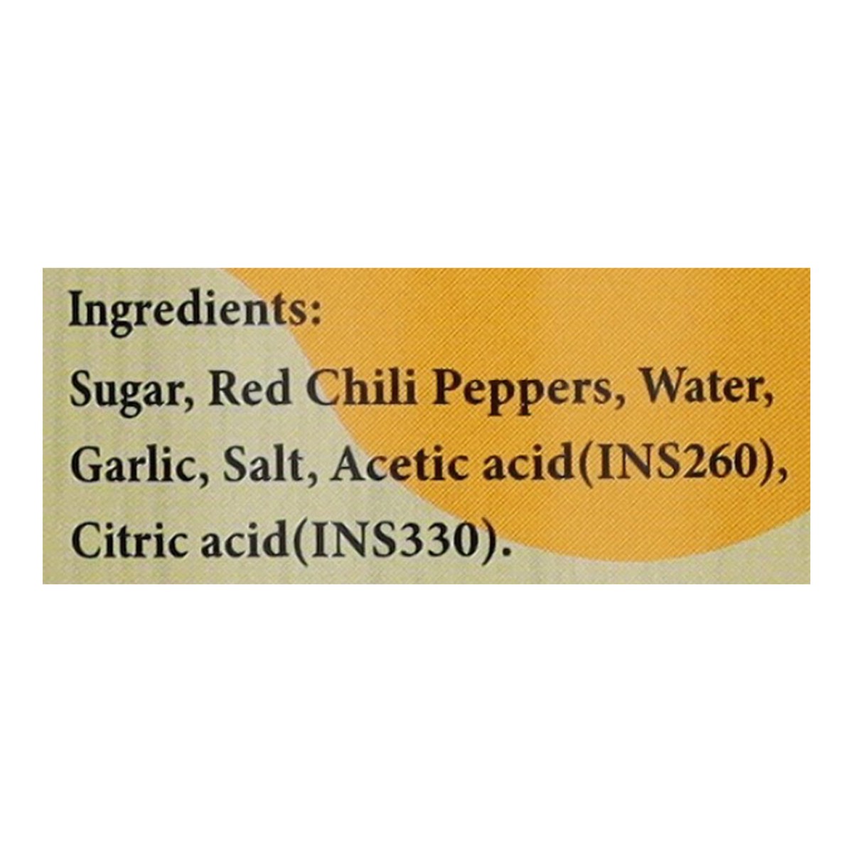 Sugar, Red Chili Peppers, Water, Garlic, Salt, Acetic Acid (INS260), Citric Acid (INS330).
