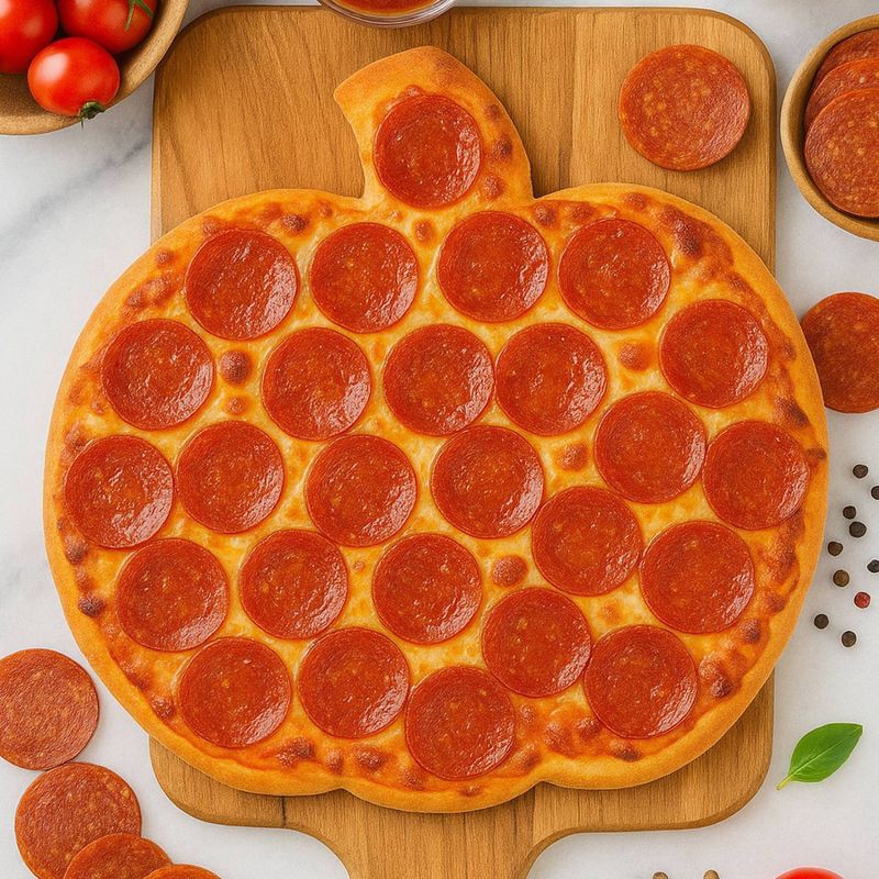 - Festive pumpkin-shaped pepperoni pizza