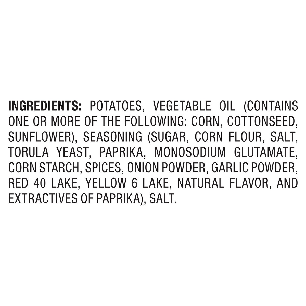Potatoes, Vegetable Oil (Contains One or More of the Following: Corn, Cottonseed, Sunflower), Seasoning (Sugar, Corn Flour, Salt, Torula Yeast, Paprika, Monosodium Glutamate, Corn Starch, Spices, Onio…