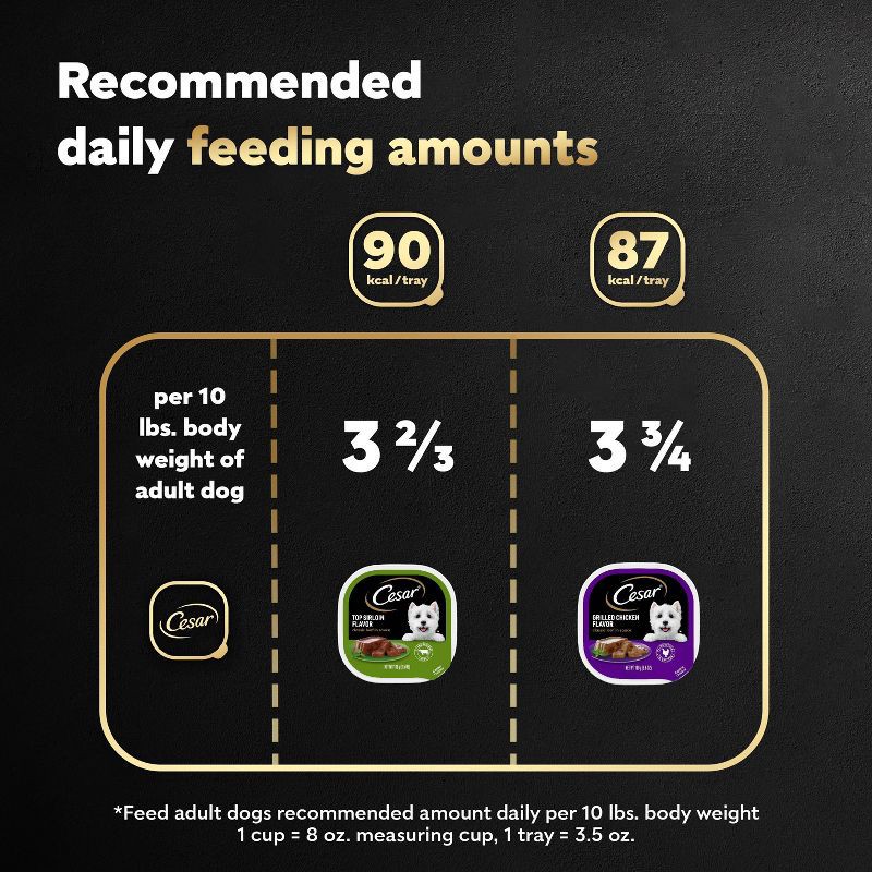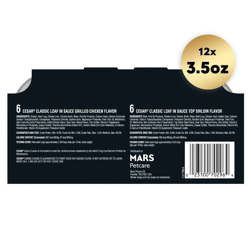 - Variety Pack: Contains twelve (12) 3.5 oz. trays of Cesar Classic Loaf in Sauce Wet Dog Food Variety Pack: (6) Grilled Chicken Flavor, and (6) Top Sirloin Flavor.