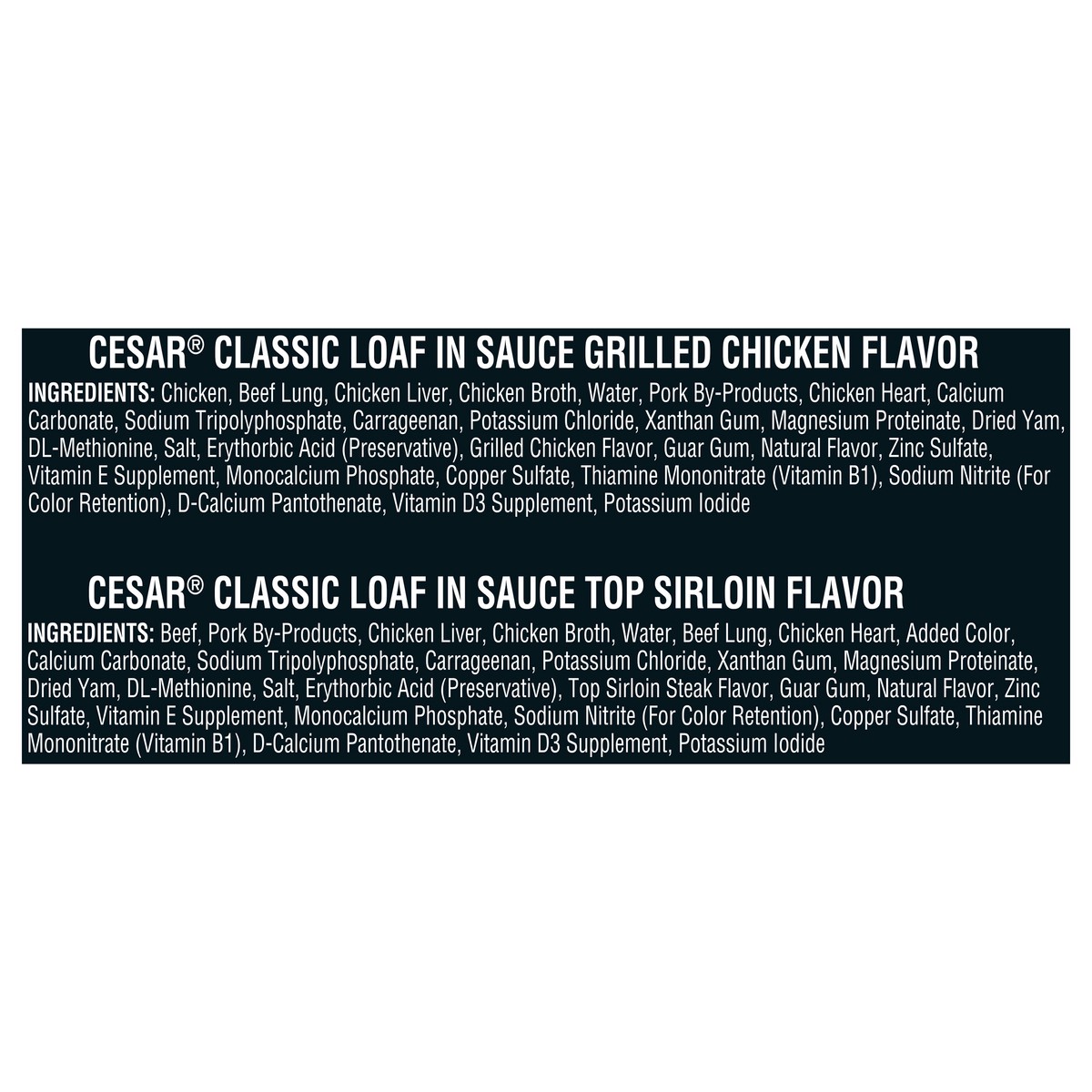 Cesar Classic Loaf in Sauce Grilled Chicken Flavor: Chicken, Beef Lung, Chicken Liver, Chicken Broth, Water, Pork By-Products, Chicken Heart, Calcium Carbonate, Sodium Tripolyphosphate, Carrageenan, P…
