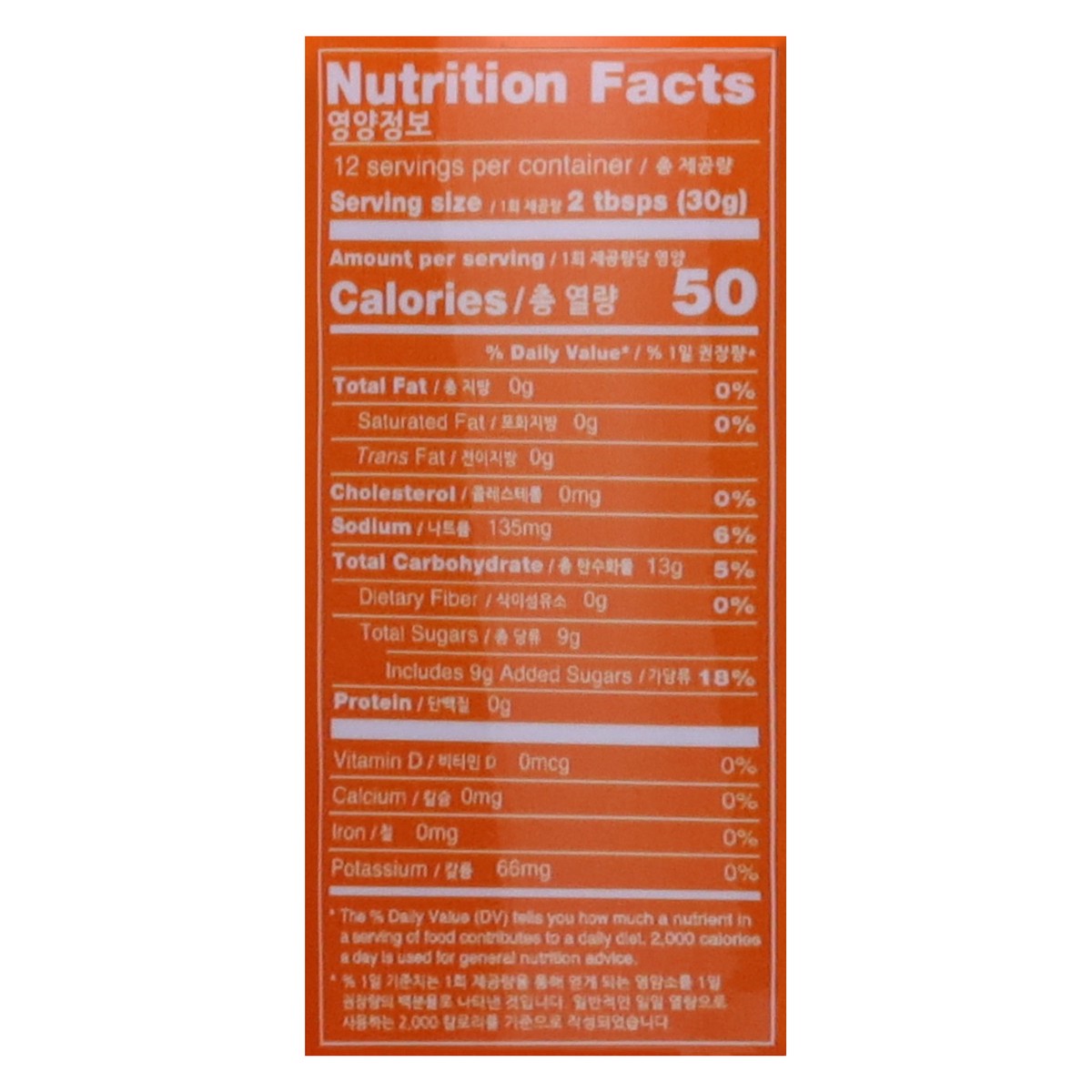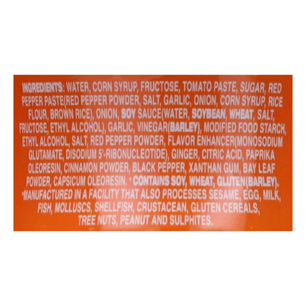 Water, Corn Syrup, Fructose, Tomato Paste, Sugar, Red Pepper Paste (Red Pepper Powder, Salt, Garlic, Onion, Corn Syrup, Rice Flour, Brown Rice), Onion, Soy Sauce (Water, Soybean, Wheat, Salt, Fructose…