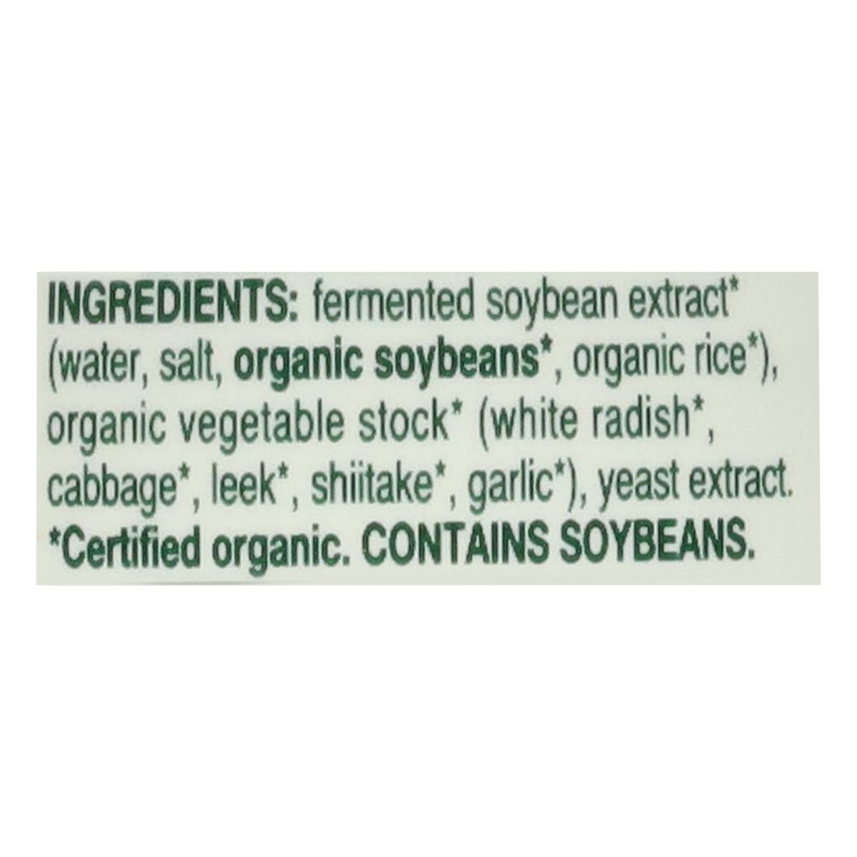 Fermented Soybean Extract* (Water, Salt, Organic Soybeans*, Organic Rice*), Organic Vegetable Stock* (White Radish*, Cabbage*, Leek*, Shiitake*, Garlic*), Yeast Extract. * Certified Organic.