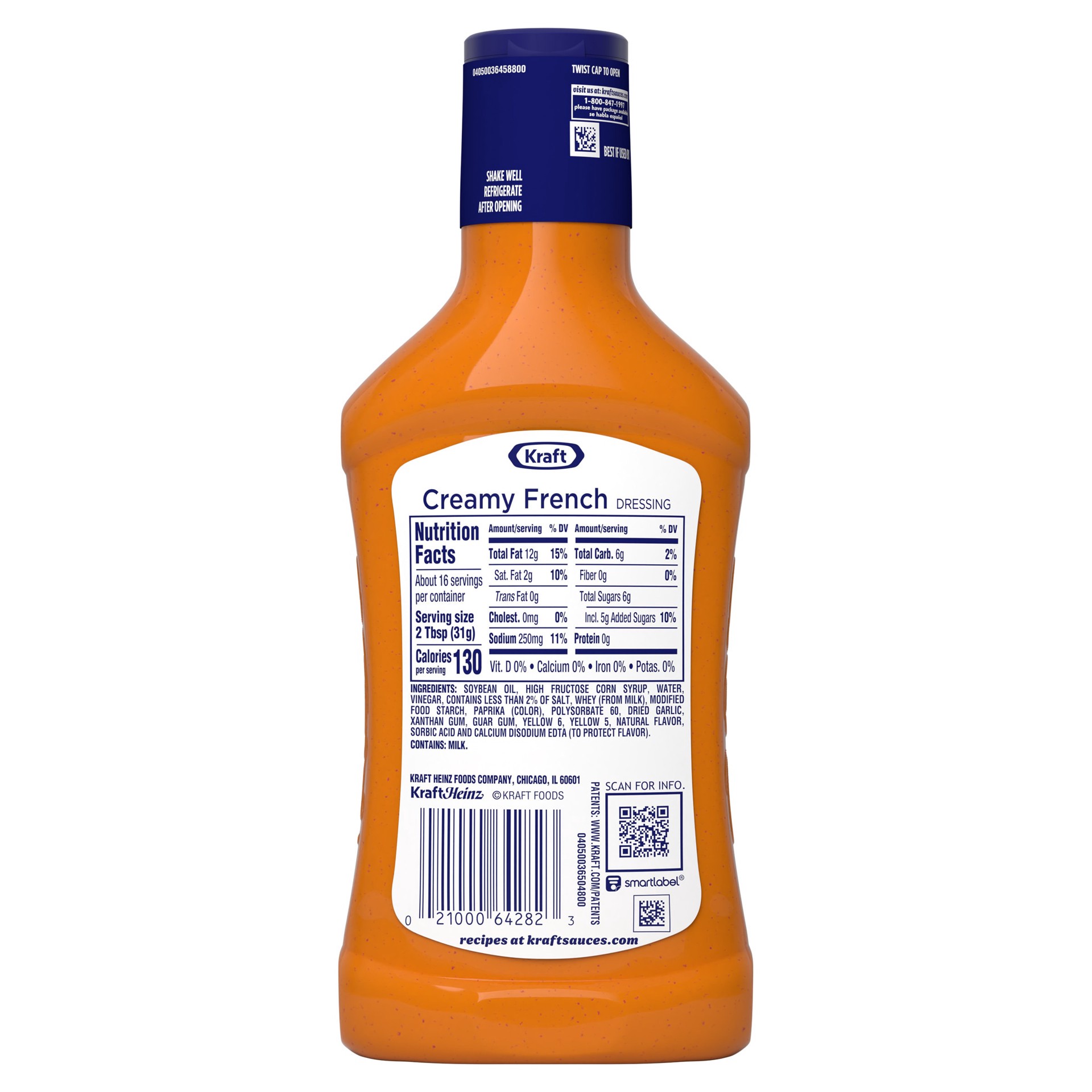 SOYBEAN OIL, HIGH FRUCTOSE CORN SYRUP, WATER, VINEGAR, CONTAINS LESS THAN 2% OF SALT, WHEY (FROM MILK), MODIFIED FOOD STARCH, PAPRIKA (COLOR), POLYSORBATE 60, DRIED GARLIC, XANTHAN GUM, GUAR GUM, YELL…