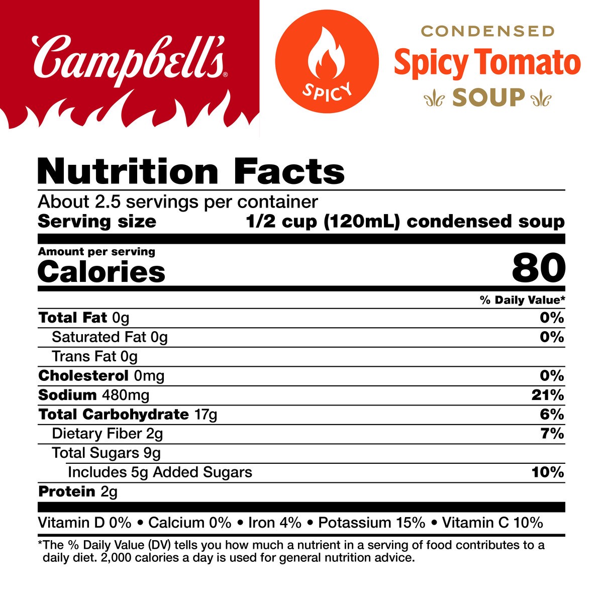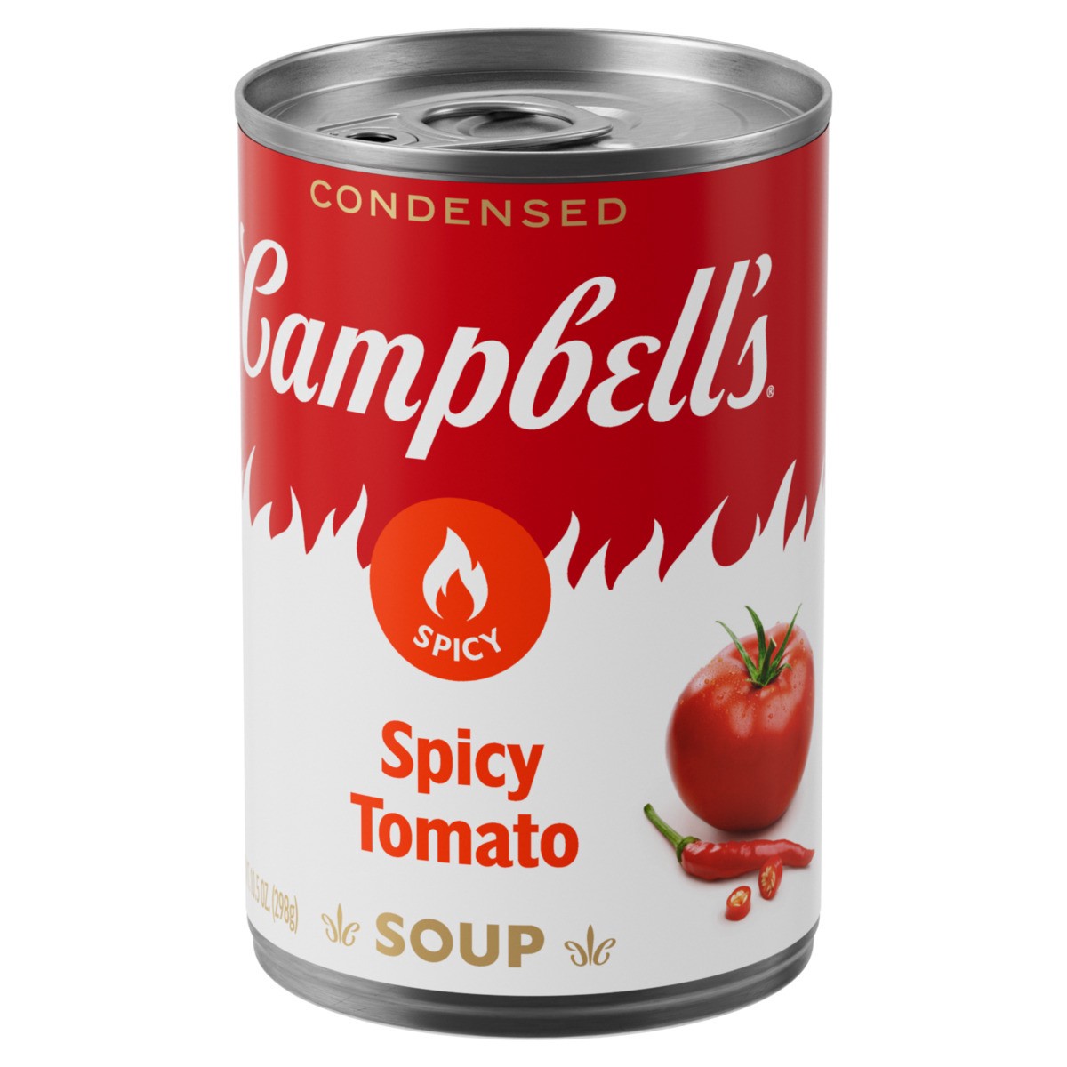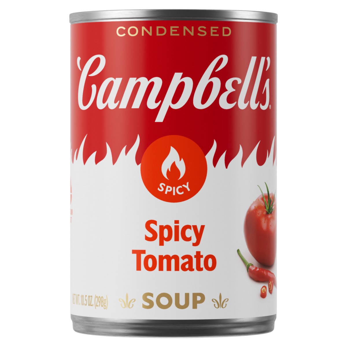 Cozy up with a steamy bowl of Campbell''s Condensed Spicy Tomato Soup. A unique twist on a family favorite, this vegan soup is crafted with tomatoes, cayenne pepper sauce and chili pepper extract for …