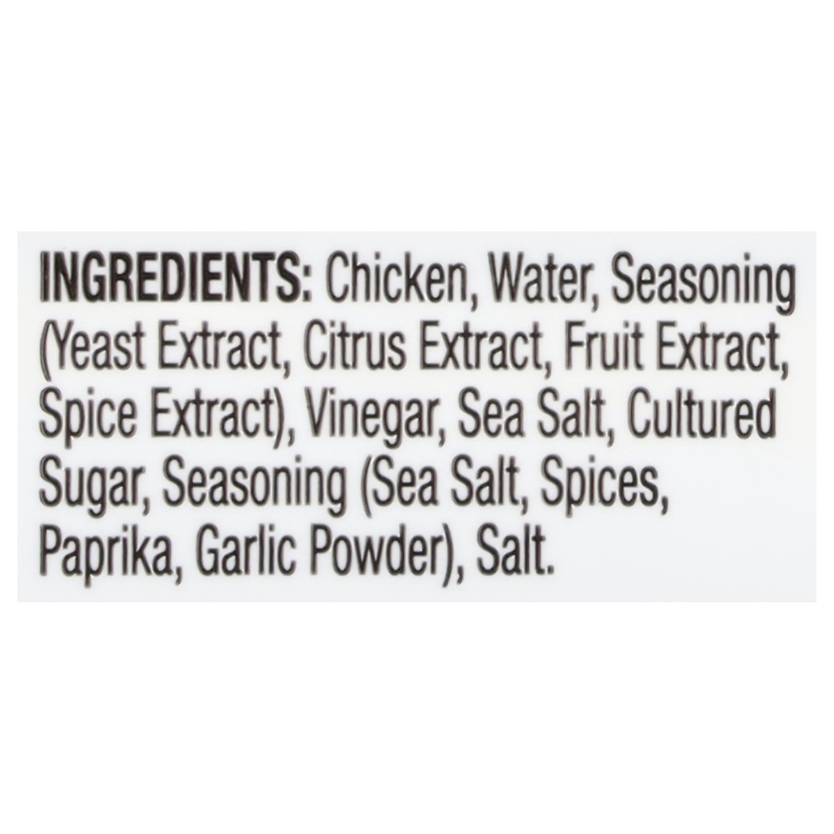 Chicken, Water, Seasoning (Yeast Extract, Citrus Extract, Fruit Extract, Spice Extract), Vinegar, Sea Salt, Cultured Sugar, Seasoning (Sea Salt, Spices, Paprika, Garlic Powder), Salt.