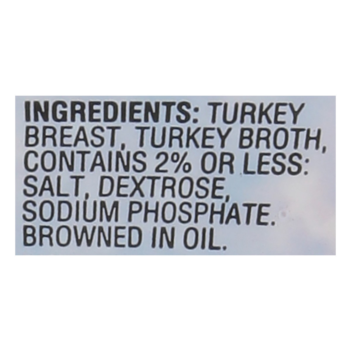 Turkey Breast, Turkey Broth, Contains 2% or Less: Salt, Dextrose, Sodium Phosphate. Browned in Oil.