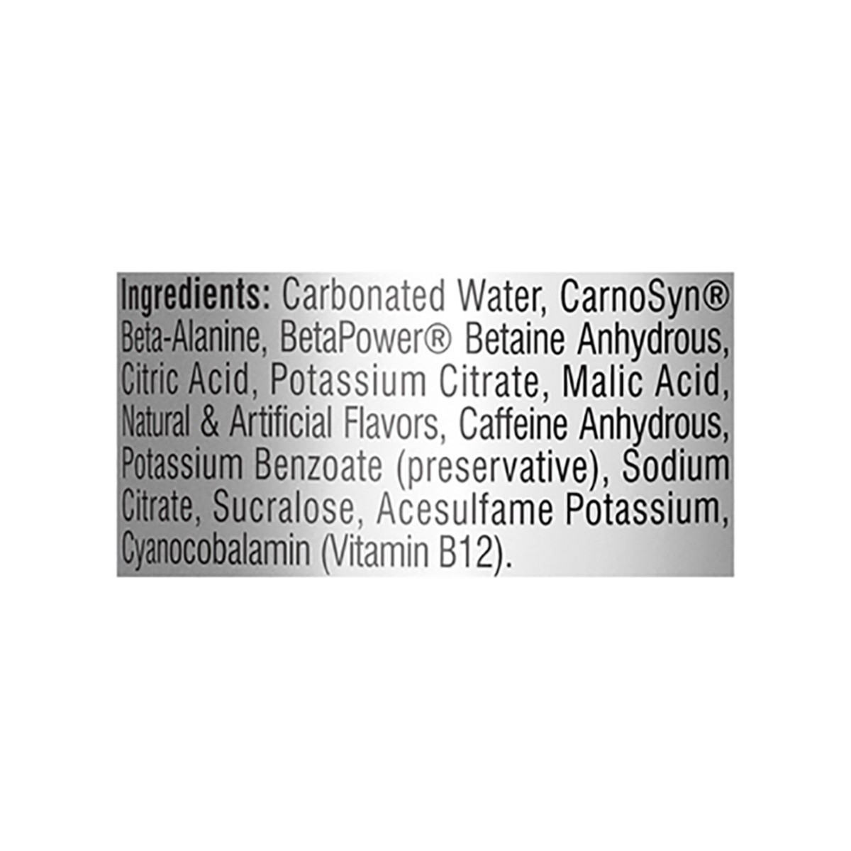 Carbonated Water, Carnosyn Beta-Alanine, Betapower Betaine Anhydrous, Citric Acid, Potassium Citrate, Malic Acid, Natural & Artificial Flavors, Caffeine Anhydrous, Potassium Benzoate (Preservative), S…