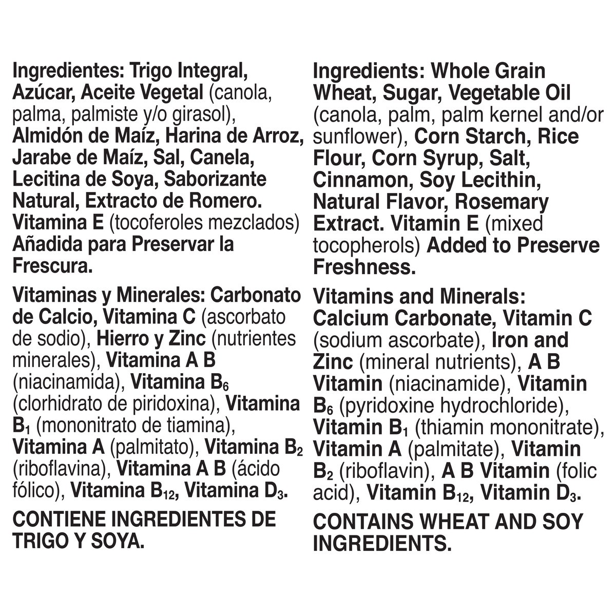 Whole Grain Wheat, Sugar, Vegetable Oil (Canola, Palm, Palm Kernel and/or Sunflower), Corn Starch, Rice Flour, Corn Syrup, Salt, Cinnamon, Soy Lecithin, Natural Flavor, Rosemary Extract, Vitamin E (Mi…