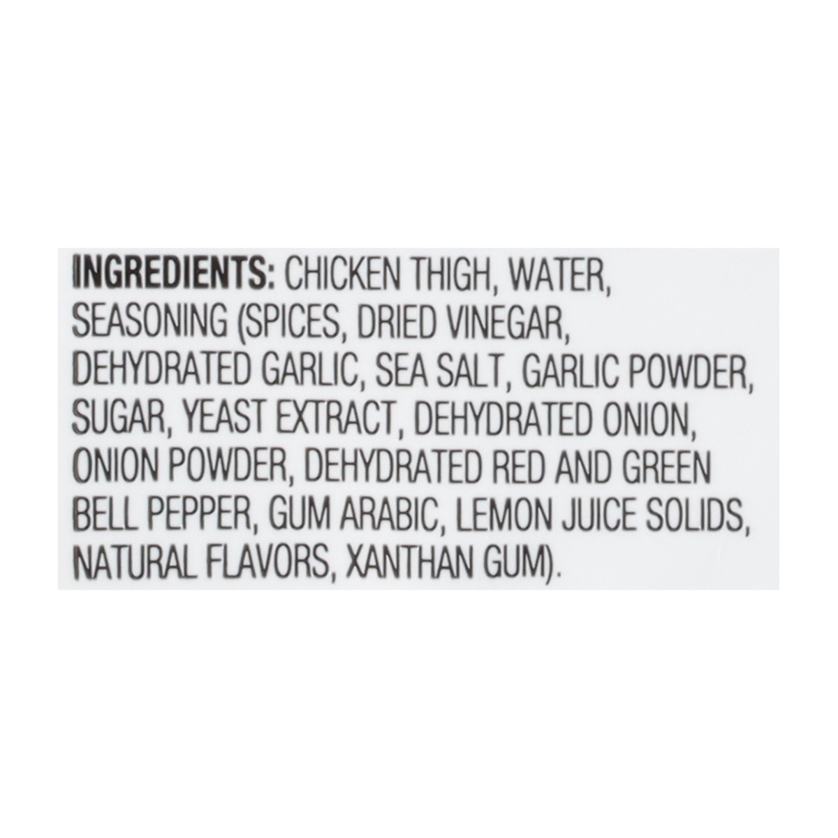 Chicken Thigh, Water, Seasoning (Spices, Dried Vinegar, Dehydrated Garlic, Sea Salt, Garlic Powder, Sugar, Yeast Extract, Dehydrated Onion, Onion Powder, Dehydrated Red and Green Bell Pepper, Gum Arab…