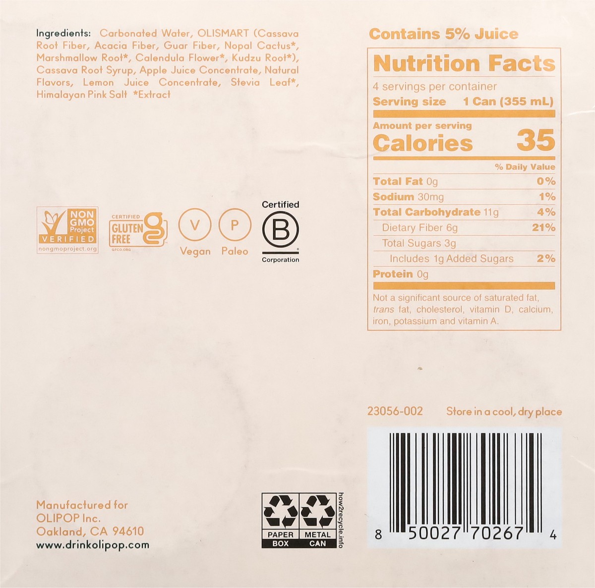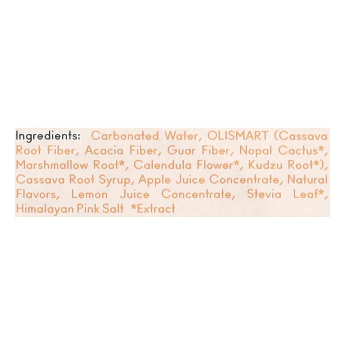 Carbonated Water, Olismart (Cassava Root Fiber, Acacia Fiber, Guar Fiber, Nopal Cactus*, Marshmallow Root*, Calendula Flower*, Kudzu Root*), Cassava Root Syrup, Apple Juice Concentrate, Natural Flavor…