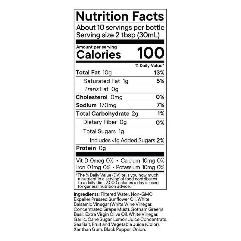 Filtered Water, Organic Sunflower Oil, White Balsamic Vinegar (Wine Vinegar, Concentrated Grape Must), Extra Virgin Olive Oil, Gotham Greens Basil, Organic White Vinegar, Garlic, Organic Sugar, Sea Sa…