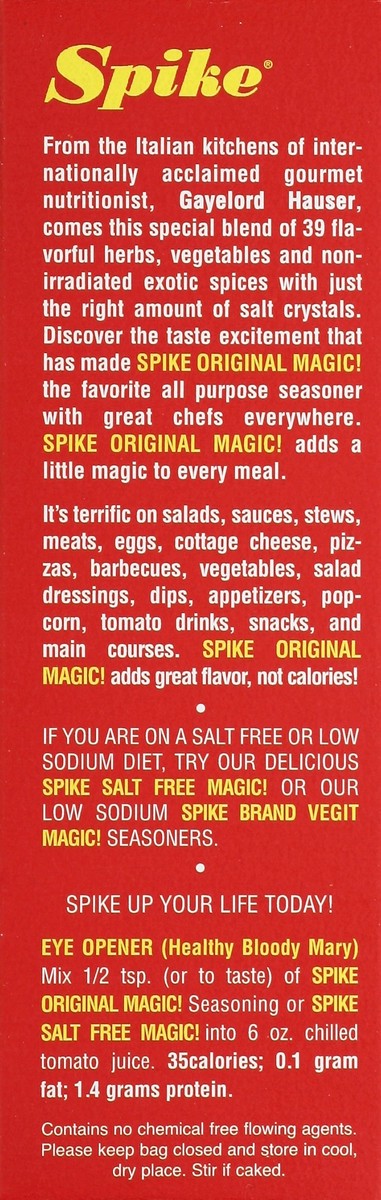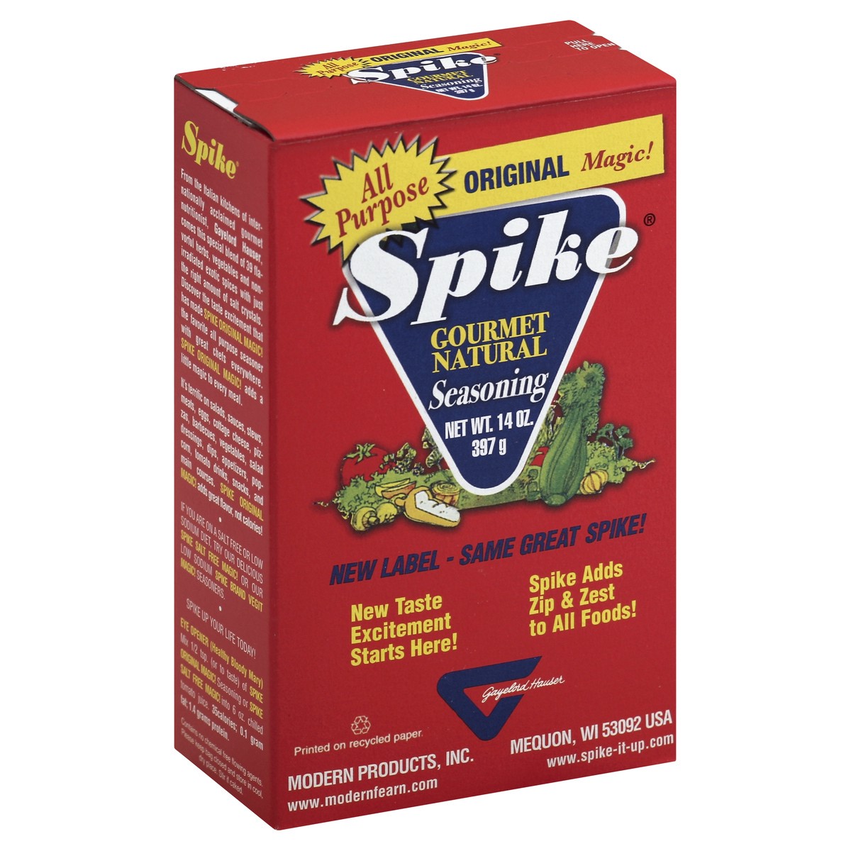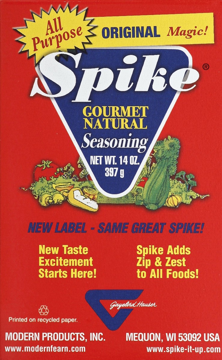 All purpose. New label - same great Spike! New taste excitement starts here! Spike adds zip & zest to all foods! Printed on recycled paper. Gayelord Hauser. www.modernfearn.com. www.spike-it-up.com. H…