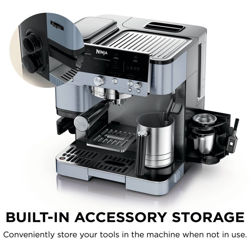 - BUILT-IN STORAGE: Conveniently store the tamper and funnel on the side of the machine when not in use, and keep brew baskets, brush, and cleaning disc in the built-in storage compartment.