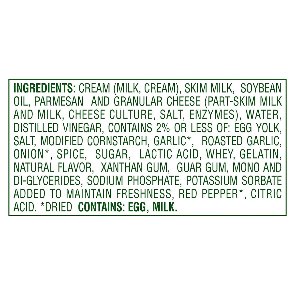 Cream (Milk, Cream), Skim Milk, Soybean Oil, Parmesan and Granular Cheese (Part-Skim Milk and Milk, Cheese Culture, Salt, Enzymes), Water, Distilled Vinegar, Contains 2% or Less of: Egg Yolk, Salt, Mo…