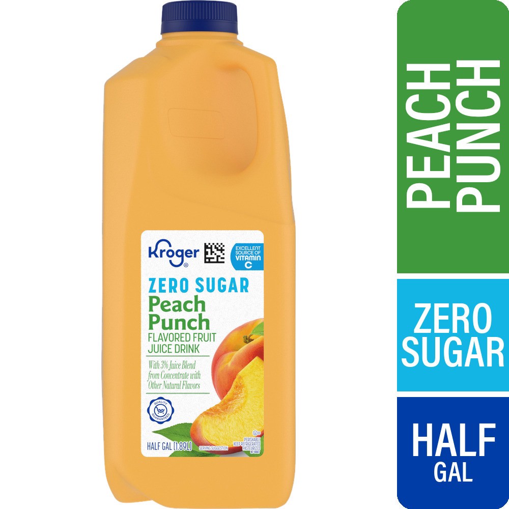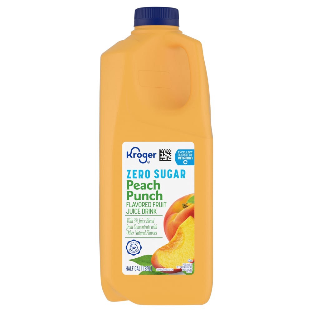Kroger® Zero Sugar Peach Punch Flavored Fruit Juice Drink packs a delightful peach punch. Enjoy each refreshing sip with 3% juice blend from concentrate twirled with other natural flavors. Featuring z…