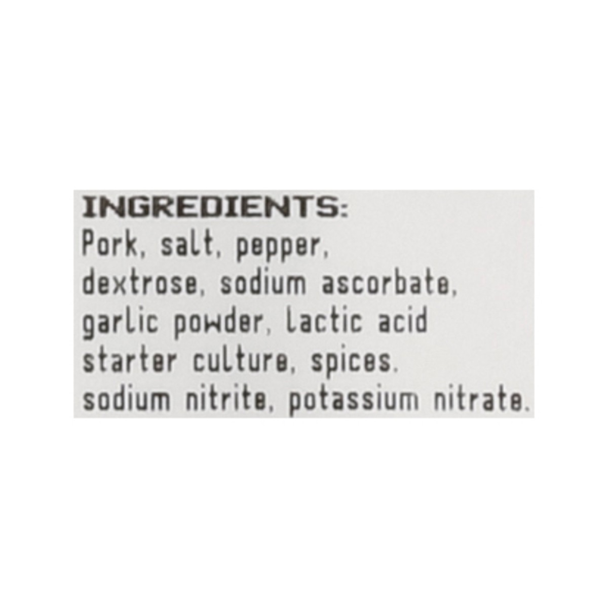 Pork, Salt, Pepper, Dextrose, Sodium Ascorbate, Garlic Powder, Lactic Acid Starter Culture, Spices, Sodium Nitrite, Potassium Nitrate.