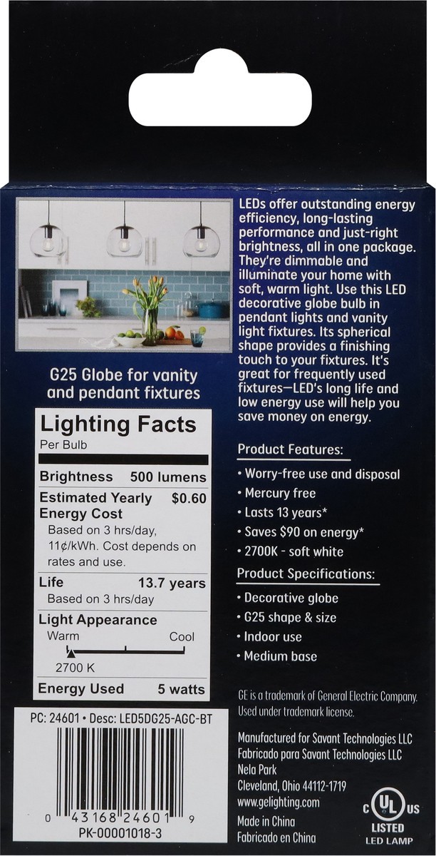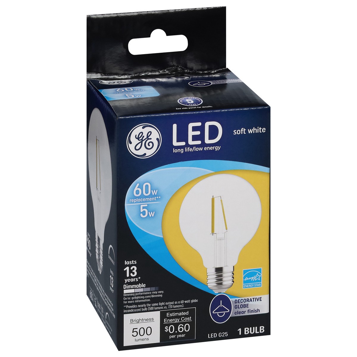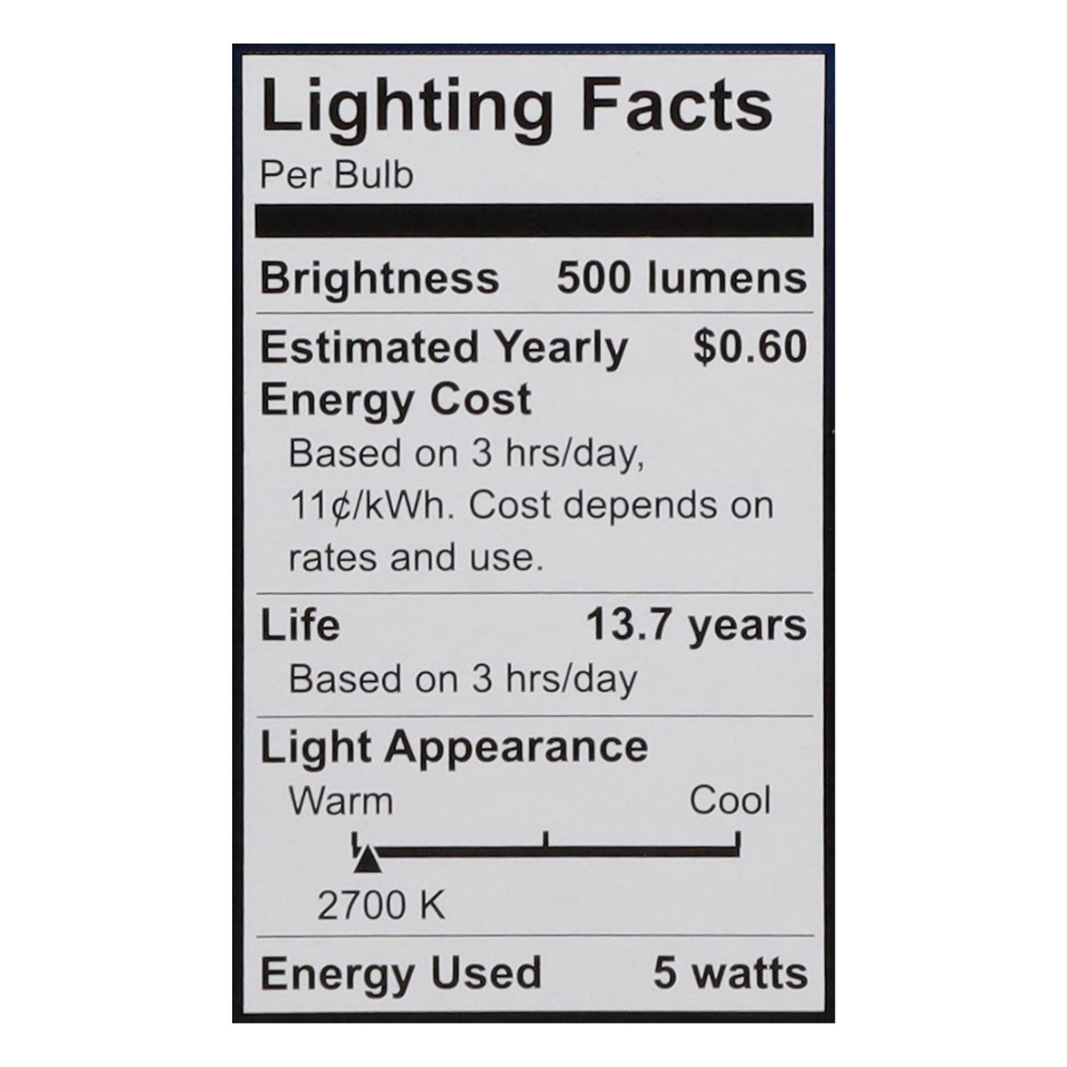 Brightness Quantity: 500 lumens. Energy Info: $0.60 based on 3 hrs/day, 11¢/kWh. Cost depends on rates and use. 5 watts. Package Info: 1. Bulb Info: LED. Is Dimmable. Screw. Bulb Life: 13.7 years base…