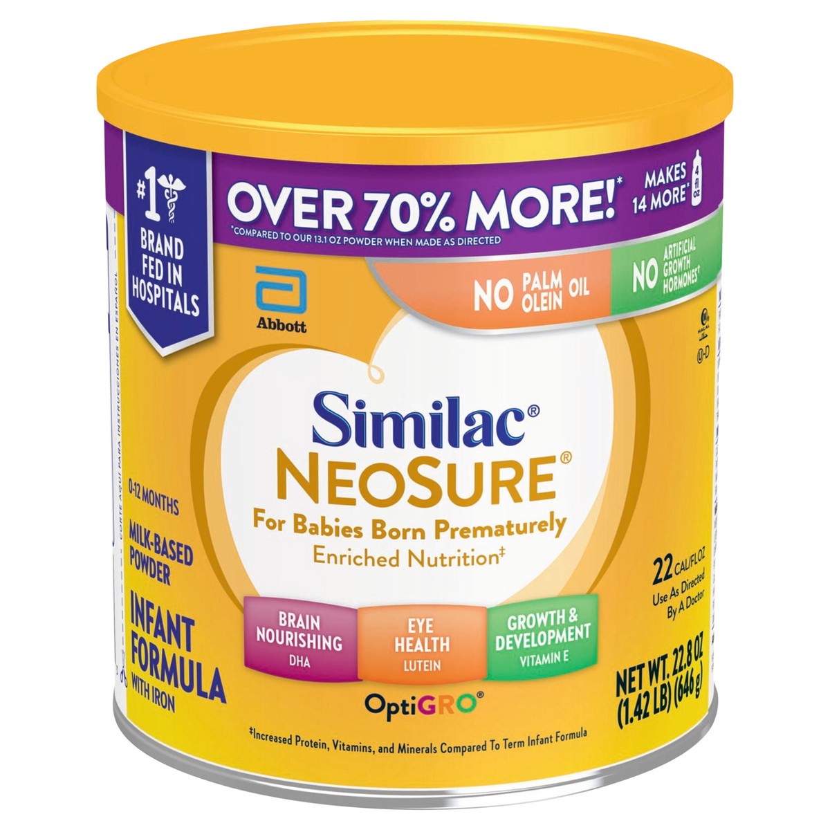 No. 1 brand fed in hospitals. Over 70% more! (compared to our 13.1 oz powder when made as directed). Makes 14 more (compared to our 13.1 oz powder when made as directed). No palm olein oil. No artific…
