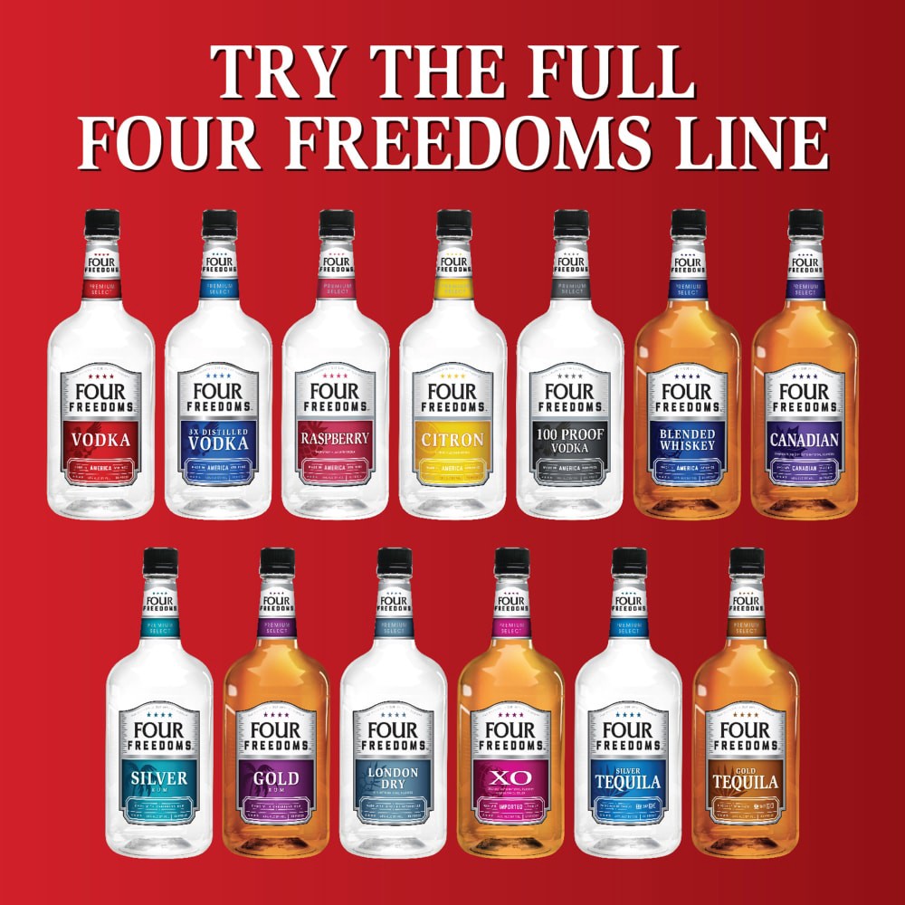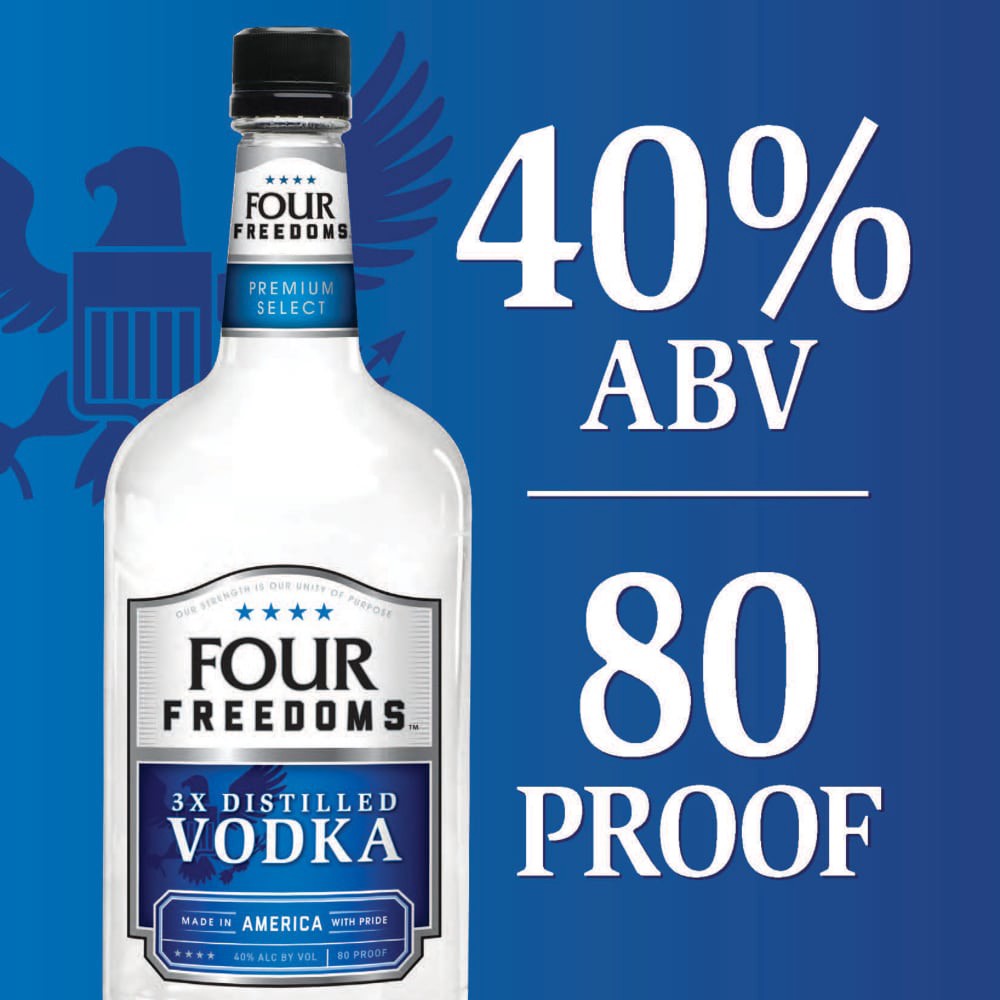 Enjoy and drink responsiblyOne 1.75 L bottle of Four Freedoms 3X Distilled Vodka, 80 ProofFour Freedoms 3X Distilled Vodka is 40% alcohol by volume for a drink you can sip chilled or enjoy in your fav…
