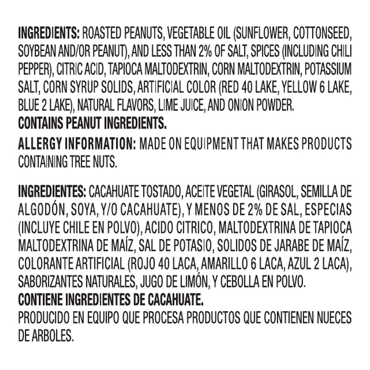 Roasted Peanuts, Vegetable Oil (Sunflower, Cottonseed, Soybean and/or Peanut), and Less than 2% of Salt, Spices (Including Chili Pepper), Citric Acid, Tapioca Maltodextrin, Corn Maltodextrin, Potassiu…
