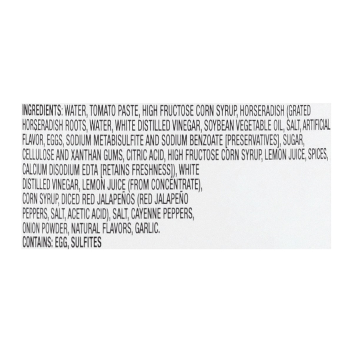Water, Tomato Paste, High Fructose Corn Syrup, Horseradish (Grated Horseradish Roots, Water, White Distilled Vinegar, Soybean Vegetable Oil, Salt, Artificial Flavor, Eggs, Sodium Metabisulfite and Sod…