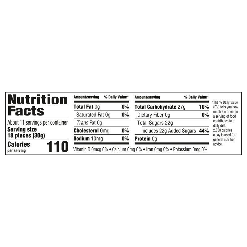 DEXTROSE, CORN SYRUP, SUGAR, MODIFIED FOOD STARCH, CONTAINS 2% OR LESS OF MALIC ACID (DL-MALIC ACID), TAPIOCA DEXTRIN, COLOR ADDED, NATURAL FLAVORS, CARNAUBA WAX, YELLOW 5 LAKE, RED 40 LAKE, YELLOW 6,…