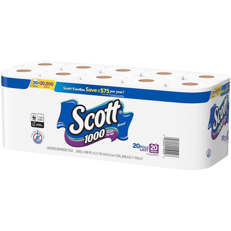 Each Scott 1000 Toilet Paper roll contains 1000 sheets. 1-ply bathroom tissue dissolves quickly, so it's sewer-safe and septic-safe. Safe for RV or boat use.
