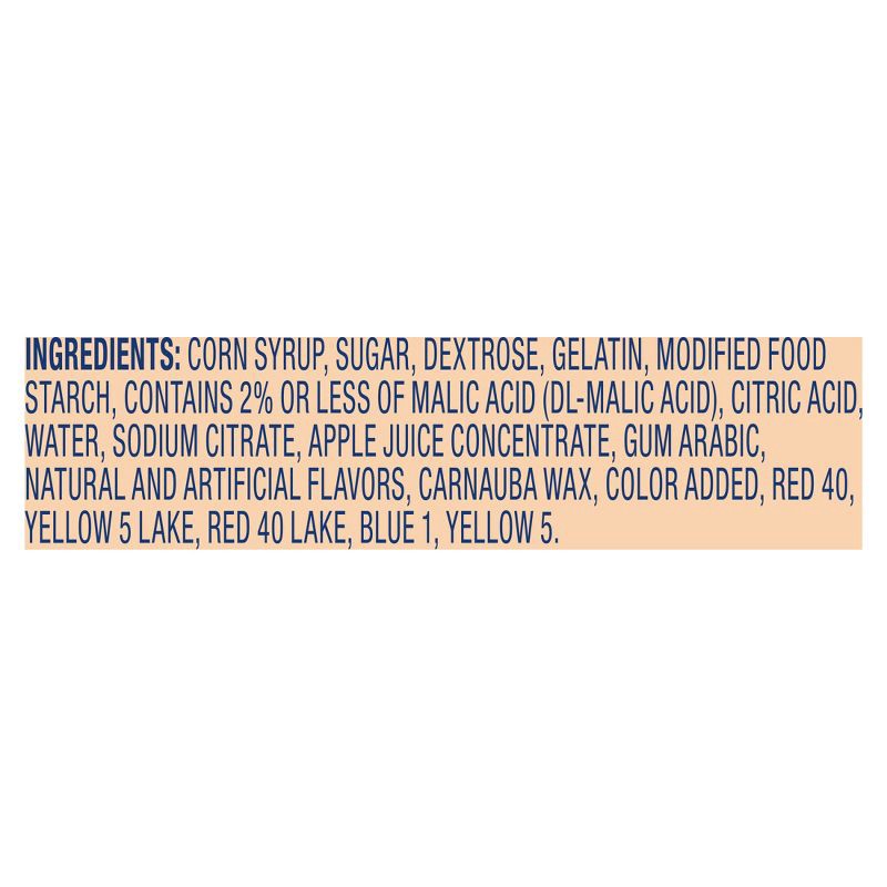 CORN SYRUP, SUGAR, DEXTROSE, GELATIN, MODIFIED FOOD STARCH, CONTAINS 2% OR LESS OF MALIC ACID (DL-MALIC ACID), CITRIC ACID, WATER, SODIUM CITRATE, APPLE JUICE CONCENTRATE, GUM ARABIC, NATURAL AND ARTI…