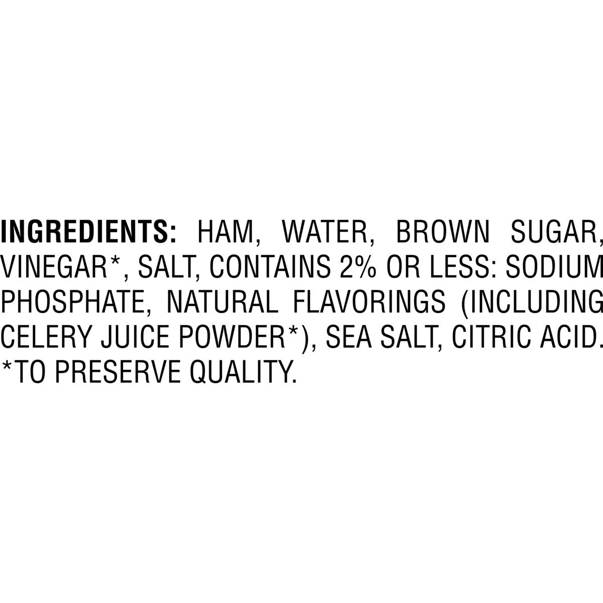 Ham, Water, Brown Sugar, Vinegar*, Salt, Contains 2% Or Less: Sodium Phosphate, Natural Flavorings (Including Celery Juice Powder*), Sea Salt, Citric Acid. *To Preserve Quality.