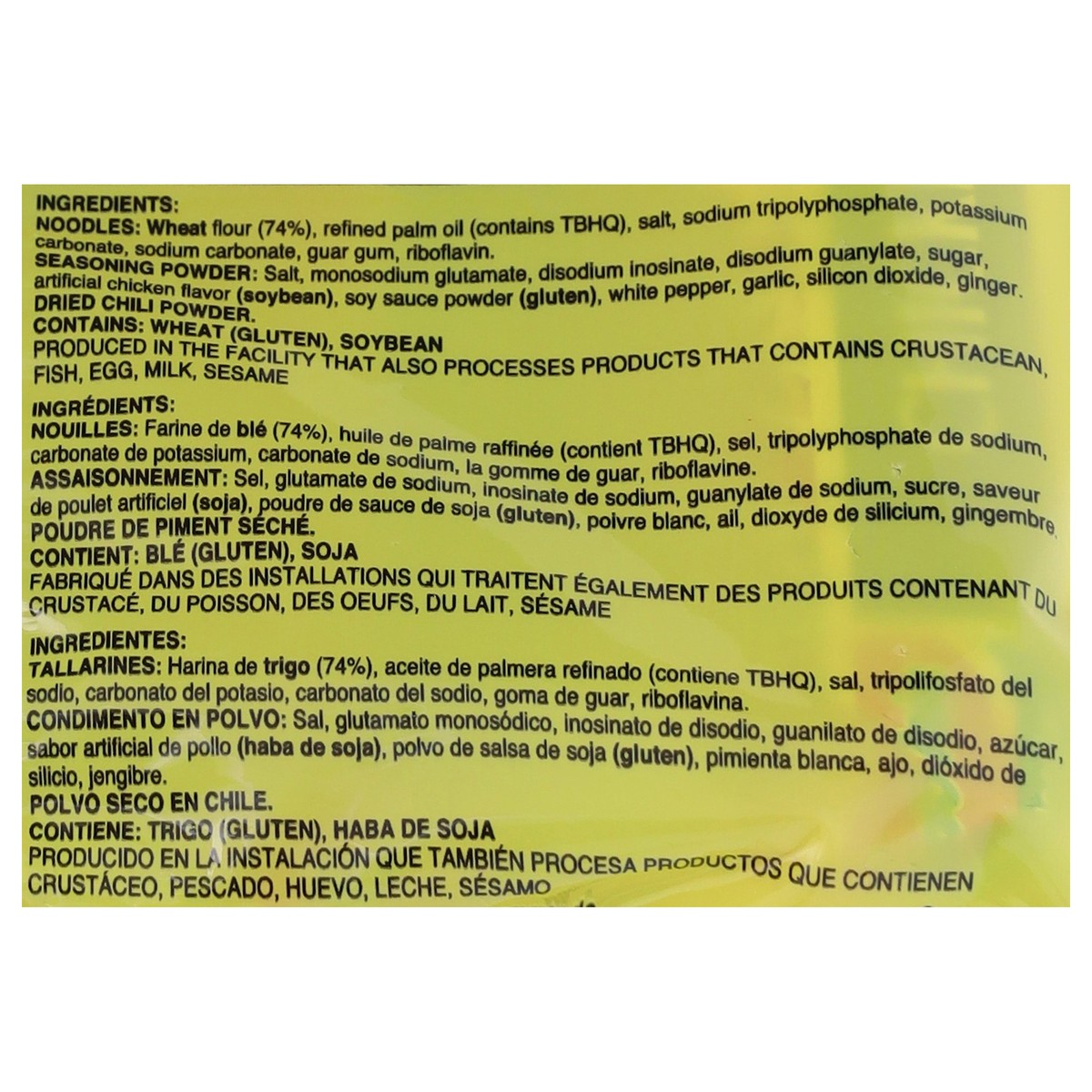Noodles: Wheat Flour (74%), Refined Palm Oil (Contains TBHQ), Salt, Sodium Tripolyphosphate, Potassium Carbonate, Sodium Carbonate, Guar Gum, Riboflavin. Seasoning Powder: Salt, Monosodium Glutamate, …