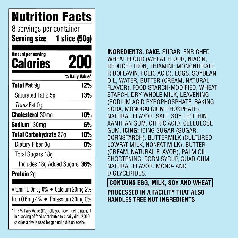 CAKE: SUGAR, ENRICHED WHEAT FLOUR (WHEAT FLOUR, NIACIN, REDUCED IRON, THIAMINE MONONITRATE, RIBOFLAVIN, FOLIC ACID), EGGS, SOYBEAN OIL, WATER, BUTTER (CREAM, NATURAL FLAVOR), FOOD STARCH-MODIFIED, WHE…