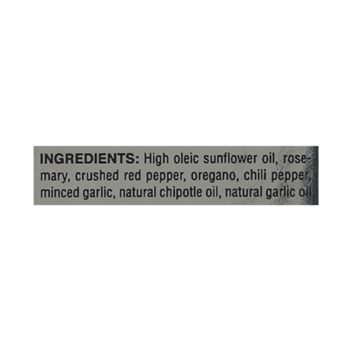 High Oleic Sunflower Oil, Rosemary, Crushed Red Pepper, Oregano, Chili Pepper Minced Garlic, Natural Chipotle Oil, Natural Garlic Oil.