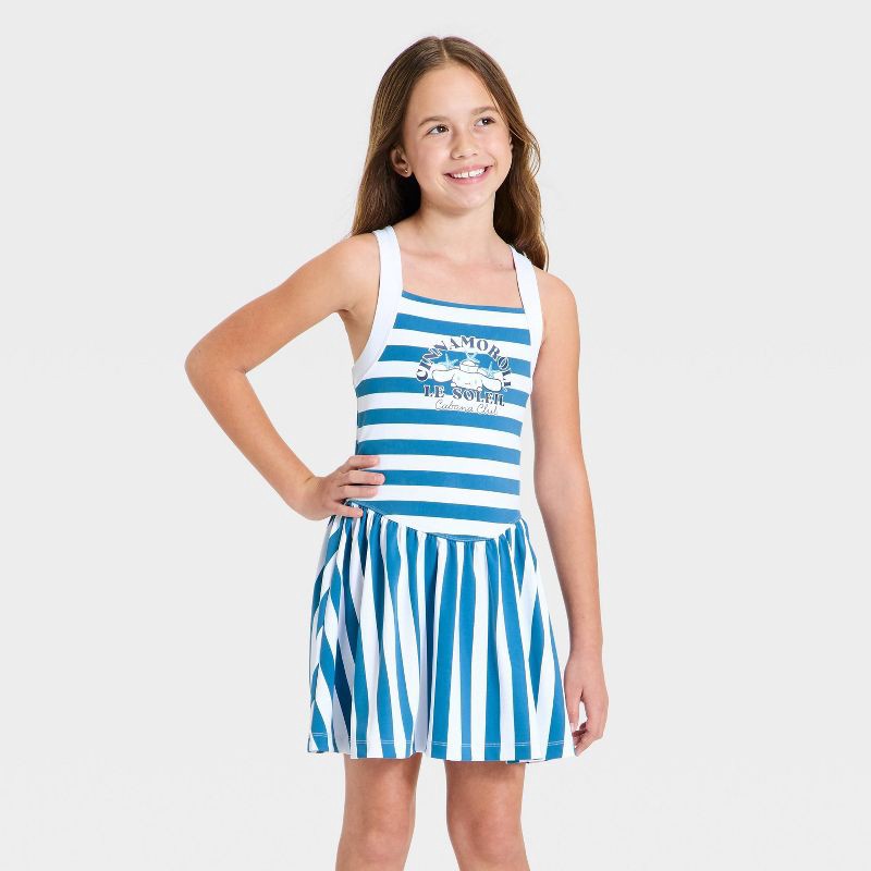Girls' Sanrio Cinnamoroll Cabana Club Striped Athletic Dress - Blue/White L