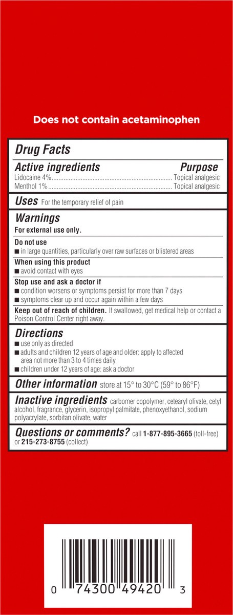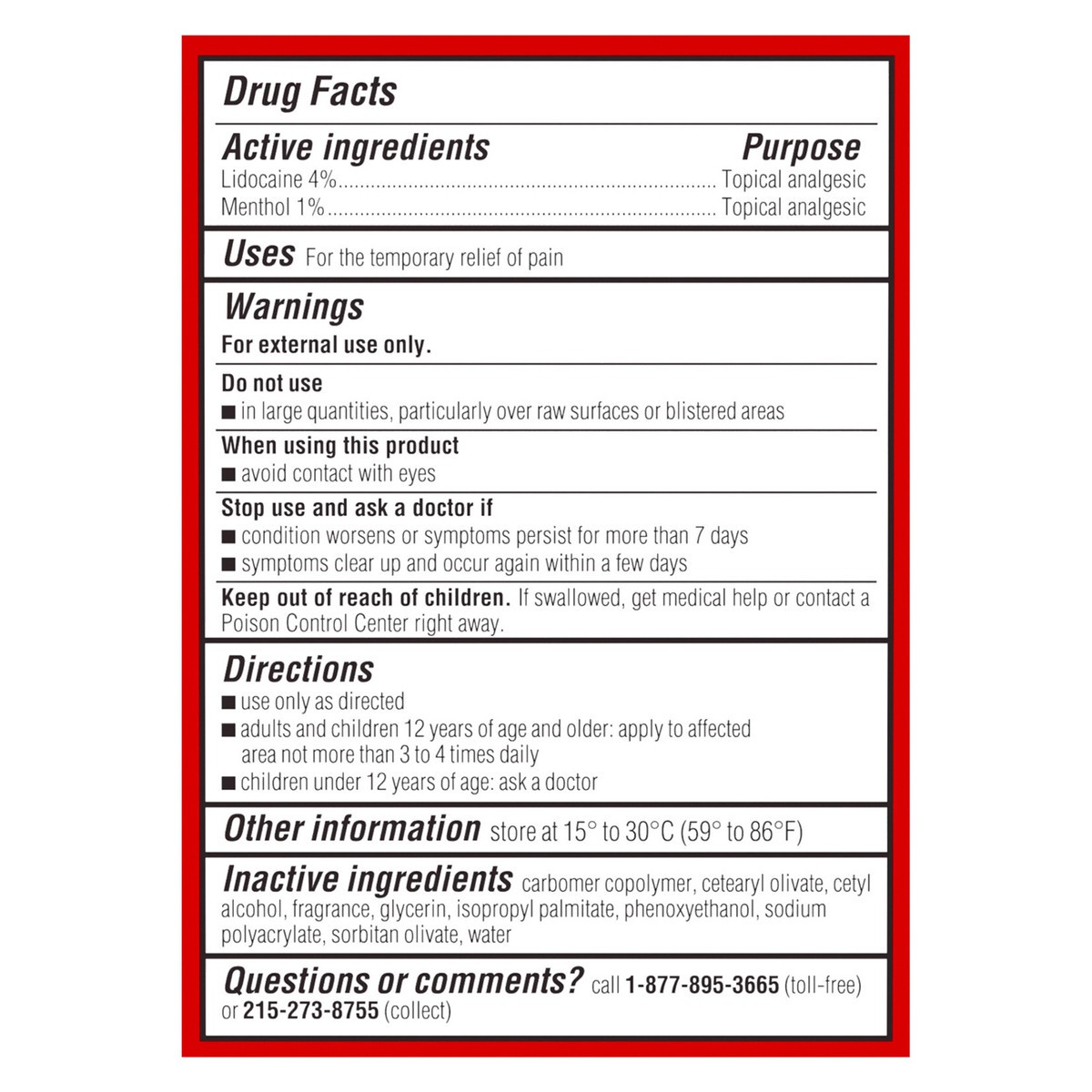 Active Ingredients: Lidocaine (4 %), Tropical Analgesic; Menthol (1 %), Tropical Analgesic. Inactive Ingredients: Carbomer Copolymer, Cetearyl Olivate, Cetyl Alcohol, Fragrance, Glycerin, Isopropyl Pa…
