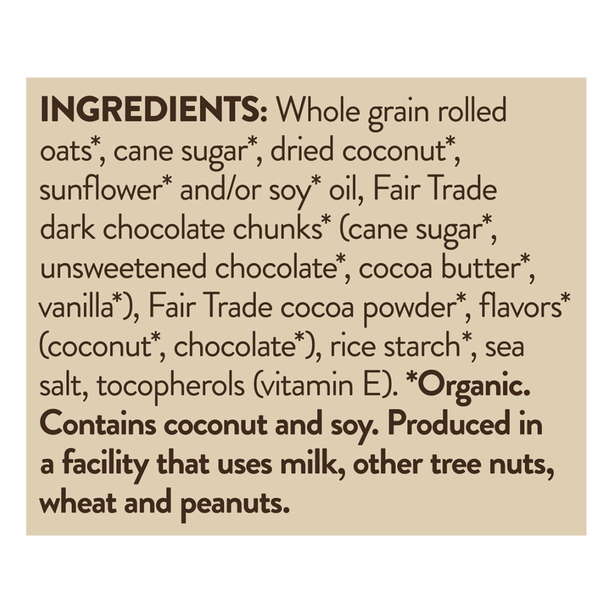 Whole Grain Rolled Oats (Organic), Cane Sugar (Organic), Dried Coconut (Organic), Sunflower (Organic) and/or Soy (Organic) Oil, Fair Trade Dark Chocolate Chunks (Organic) (Cane Sugar (Organic), Unswee…
