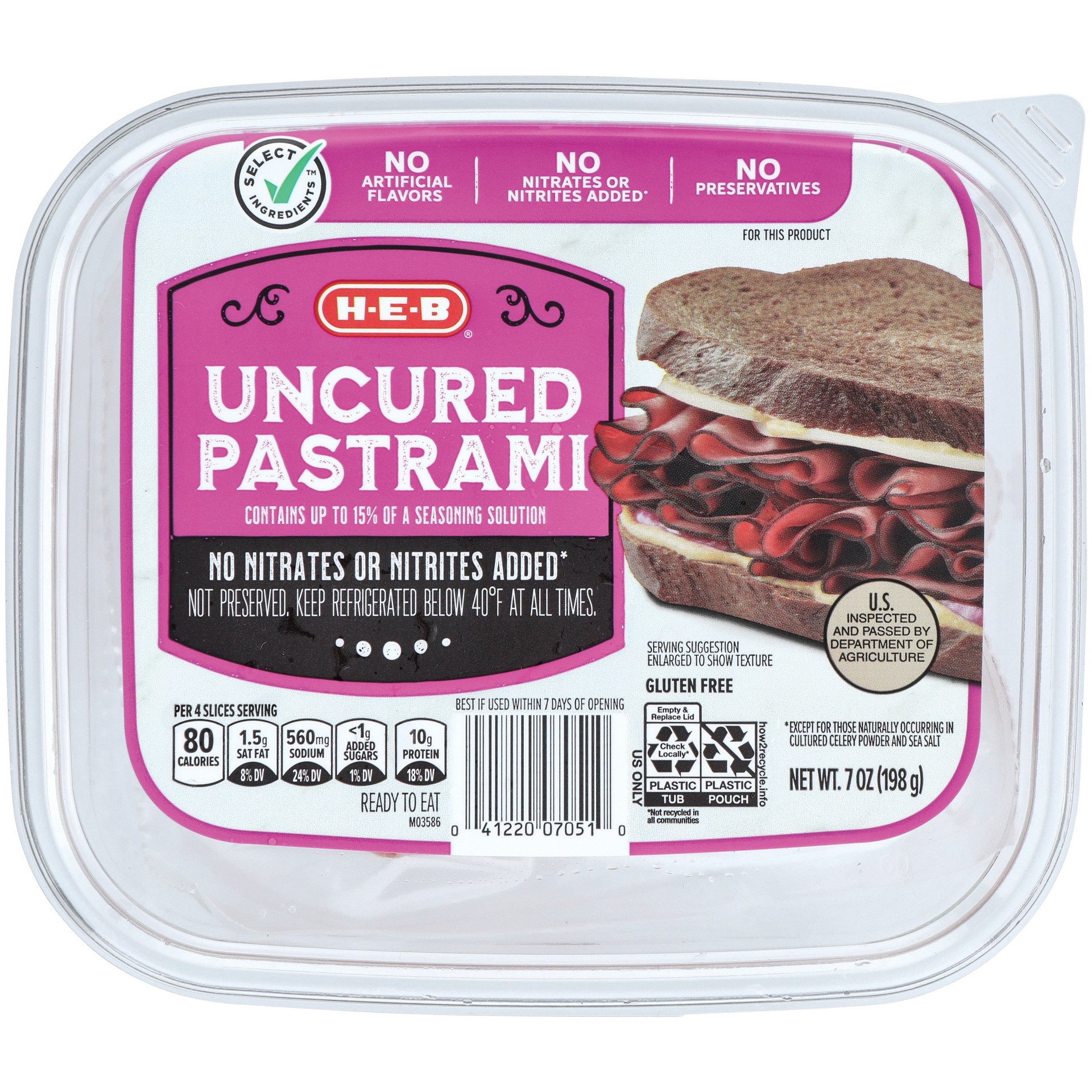 Level up lunchtime with H-E-B uncured beef pastrami. Sliced and packaged in a resealable container, it's great for making a hot pastrami on rye sandwich.• Uncured beef pastrami• Sliced• Select Ingredi…