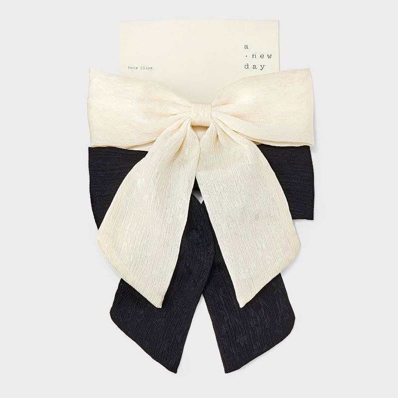 Give your hairdo a classic makeover with this Pleated Satin Bow Barrette Set from A New Day™. Made of polyester and metal, this satin bow barrette set includes one in a black hue and another in white …