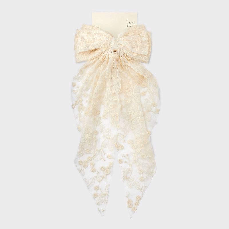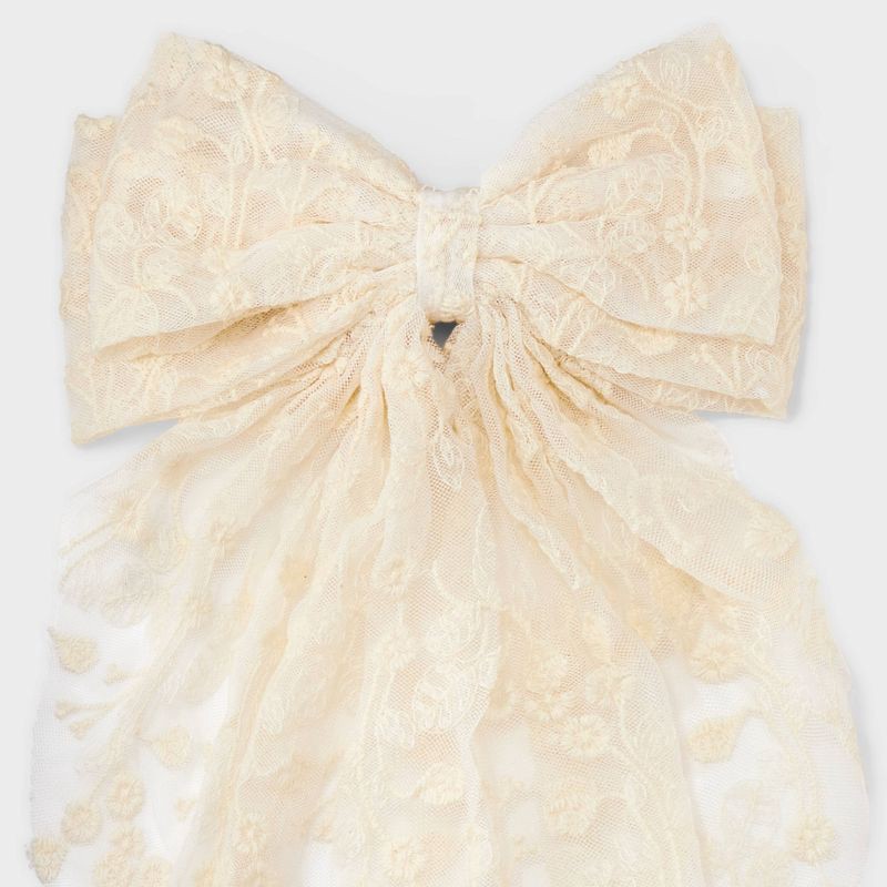 Accessorize your hair in elegant style with this Lace Double-Bow Barrette from A New Day™. This cream hair barrette features a stylish double bow with delicate lace detailing for a lovely look that ma…