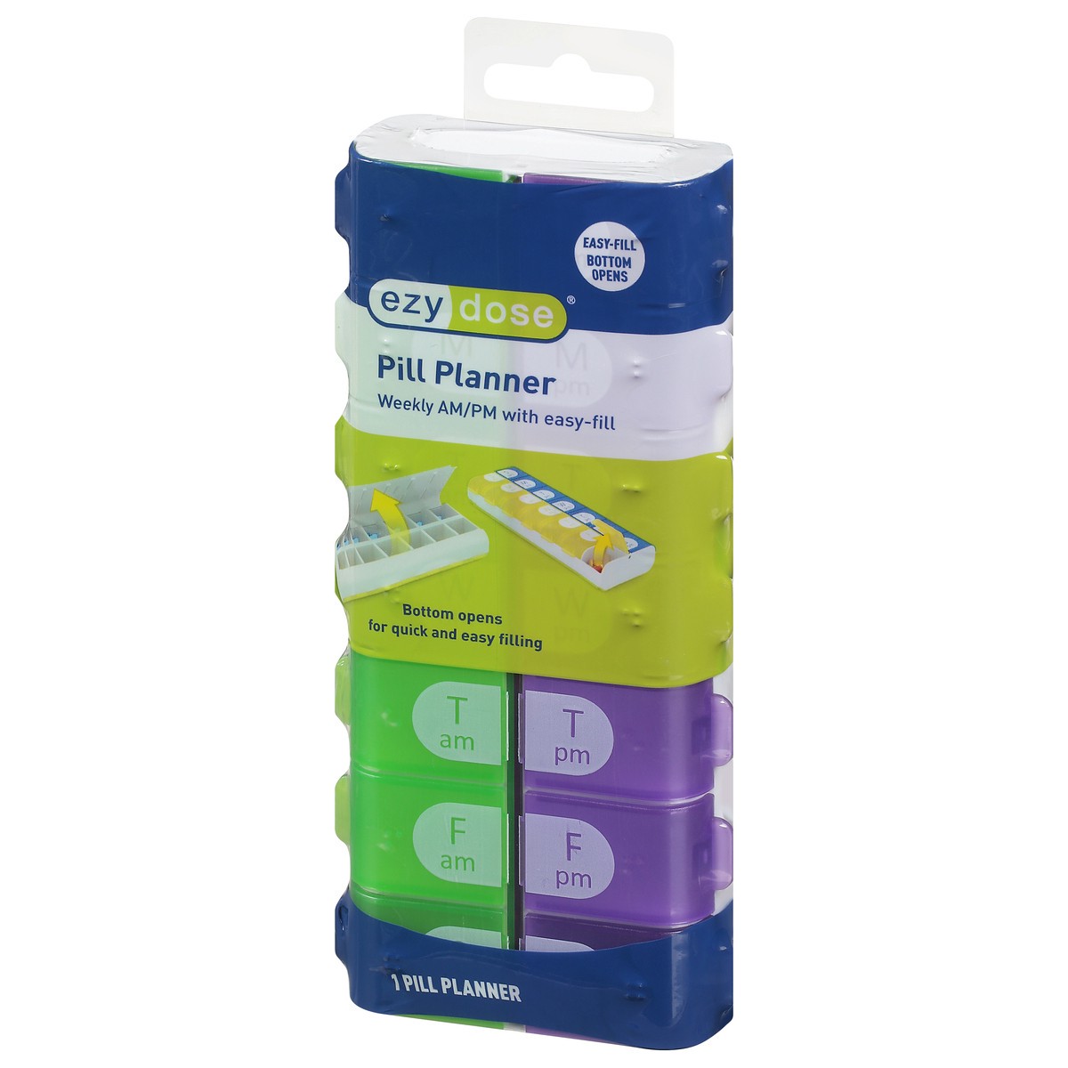 Easy fill. Entire bottom opens. Weekly AM/PM with easy -fill. Bottom opens for quick and easy filling. T (am), T (pm), F (am), F (pm). Ezy Dose is the leader in innovative, easy-to-use medication mana…