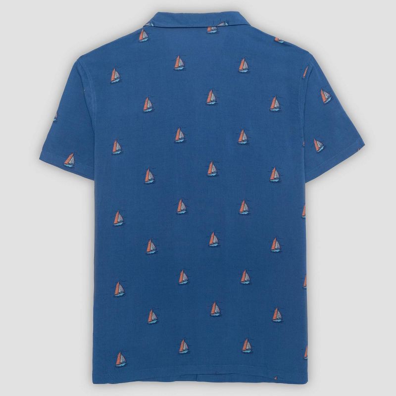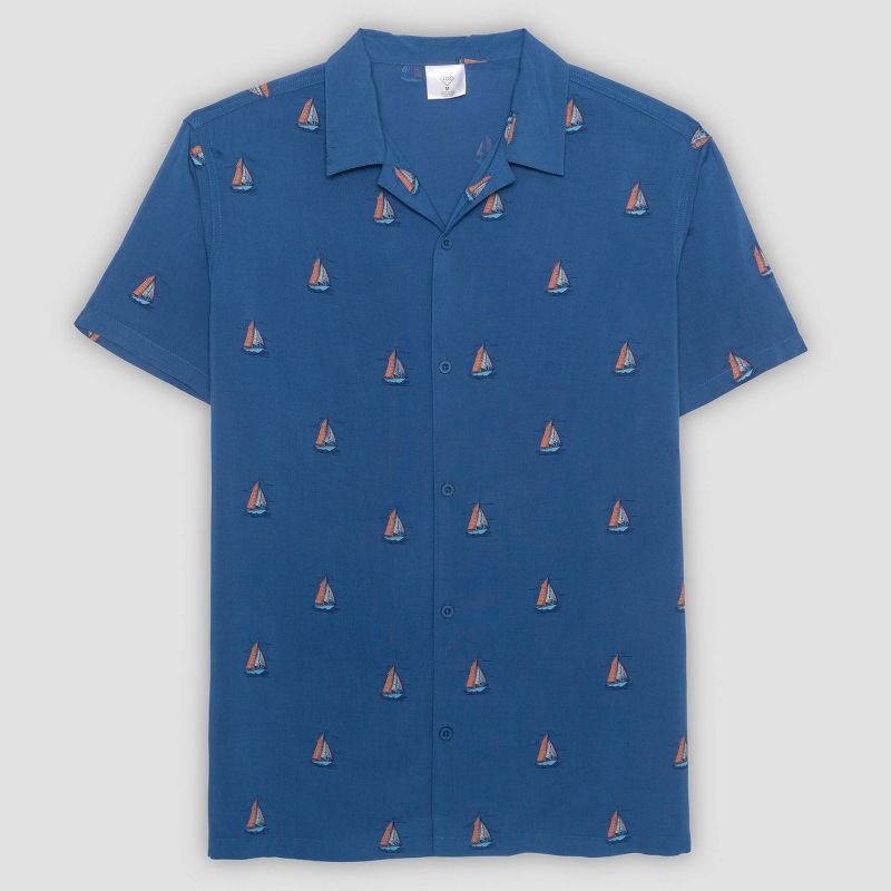 Make a stylish statement with this Sailboats Short-Sleeve Camp Collar Shirt. Made of 100% rayon for comfortable wear, this short-sleeve shirt features sailboat prints on a blue backdrop for a cool loo…