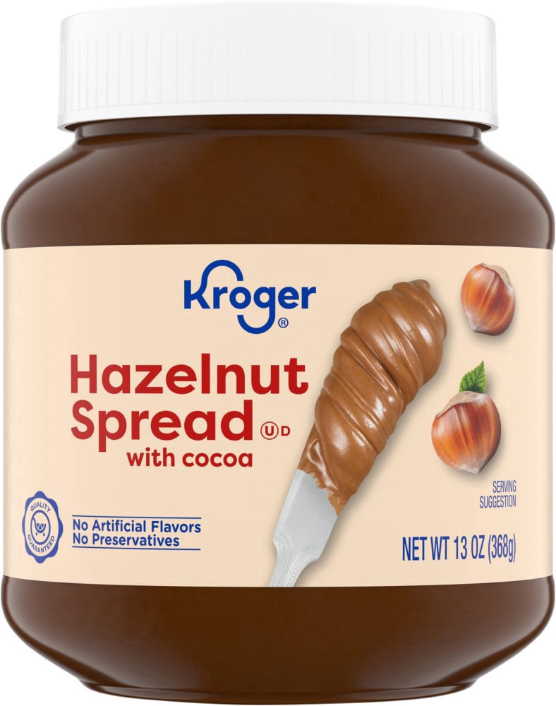 Kroger® Hazelnut Spread with Cocoa is a delightful treat! Made with sugar, hazelnuts, and cocoa powder, it's a sweet and creamy addition to your favorite foods. With no preservatives or artificial fla…