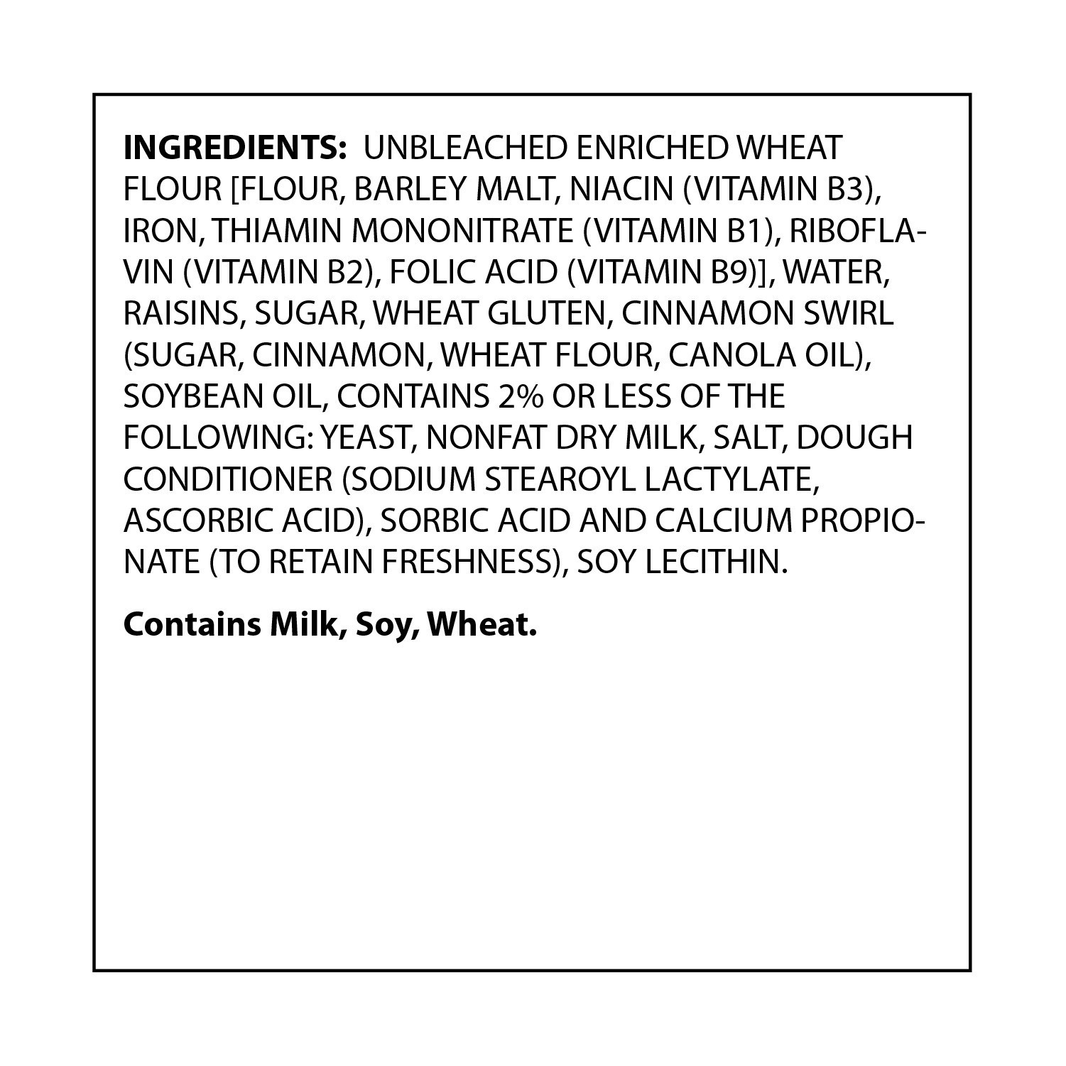 UNBLEACHED ENRICHED WHEAT FLOUR [FLOUR, BARLEY MALT, NIACIN (VITAMIN B3), IRON, THIAMIN MONONITRATE (VITAMIN B1), RIBOFLAVIN (VITAMIN B2), FOLIC ACID (VITAMIN B9)], RAISINS, WATER, SUGAR, CINNAMON SWI…
