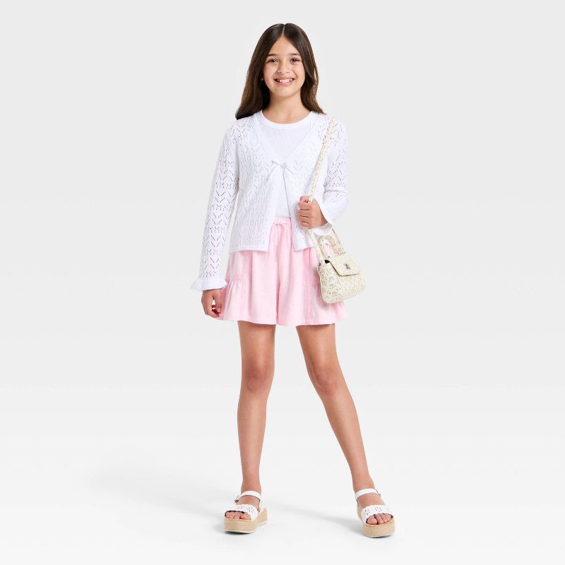 They'll look stylish on everyday outings, while playing or at school with these Lace Trim Pull-On Shorts from Cat & Jack™. Made of rayon-linen blend slub fabric, these classic-rise shorts offer all-da…